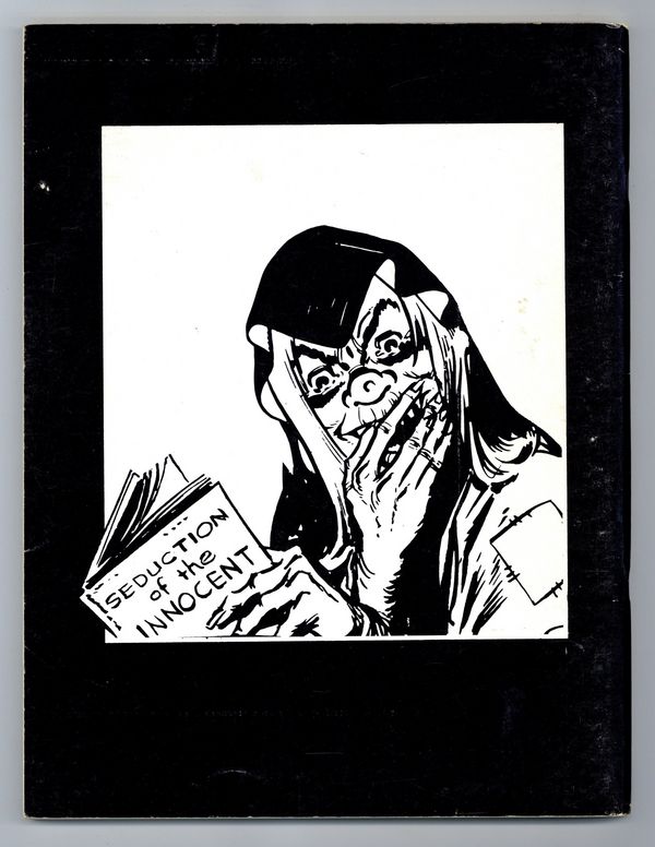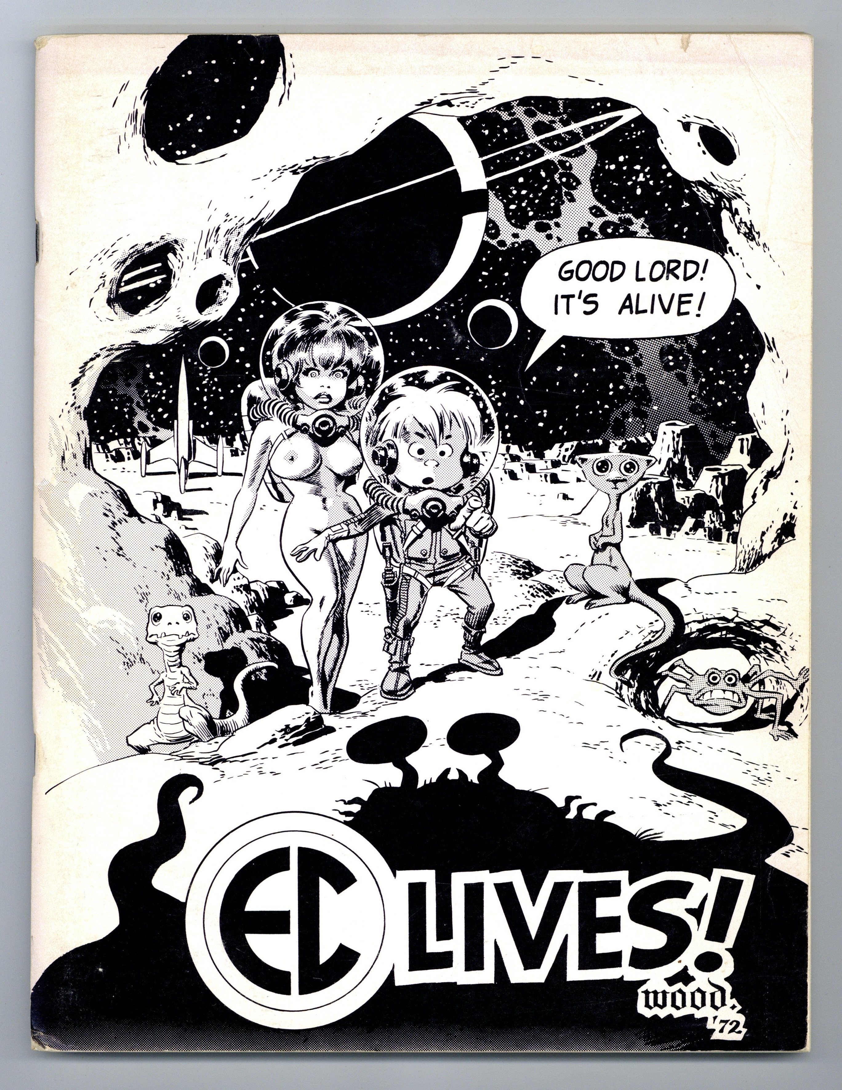 EC Lives! The 1972 EC Fan-Addict Convention Book. Cover by Wally Wood. Ron Barlow, Editor. The following EC people talk about each other and other people at fascinating length, accompanied by funny but penetrating full-page black-and-white caricatures of the whole crew by colorist Marie Severin: Bill Gaines, Roy Krenkel, Jack Davis, Wally Wood, Albert Feldstein, Harvey Kurtzman, George Evans, Marie Severin, Will Elder, B. Krigstein, John Severin, Al Williamson, Reed Crandall, Frank Frazetta, Graham Ingels, Johnny Craig, Joe Orlando, and Jack Kamen. Includes reprints in black-and-white of: "The Monkey," Joe Orlando. "Accidents and Old Lace," Graham Ingels. "Homesick," Al Williamson. "Hate," Wally Wood. "Dogfood," Reed Crandall. "Fired," Al Williamson and Frank Frazetta. "My Brother's Keeper," George Evans.