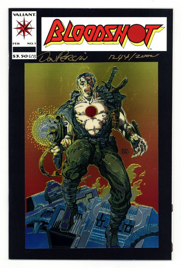 $9.00National Comics Services, Ltd. signed edition, autographed by Don Perlin and numbered to 2000 with a certificate of authenticity. Chrome cover. Cover by Barry Windsor-Smith. Blood of the Machine, script by Kevin VanHook, pencils by Don Perlin, inks by Bob Wiacek; A man with no name on the run from the mafia and the sinister Japanese conglomerate, Iwatsu Industries, Bloodshot will stop at nothing to learn the secret of his nanite-fueled second life. Geoff the Geomancer app. Bloodshot pull-out poster by Barry Windsor-Smith. 36 pgs., full color. $3.50.