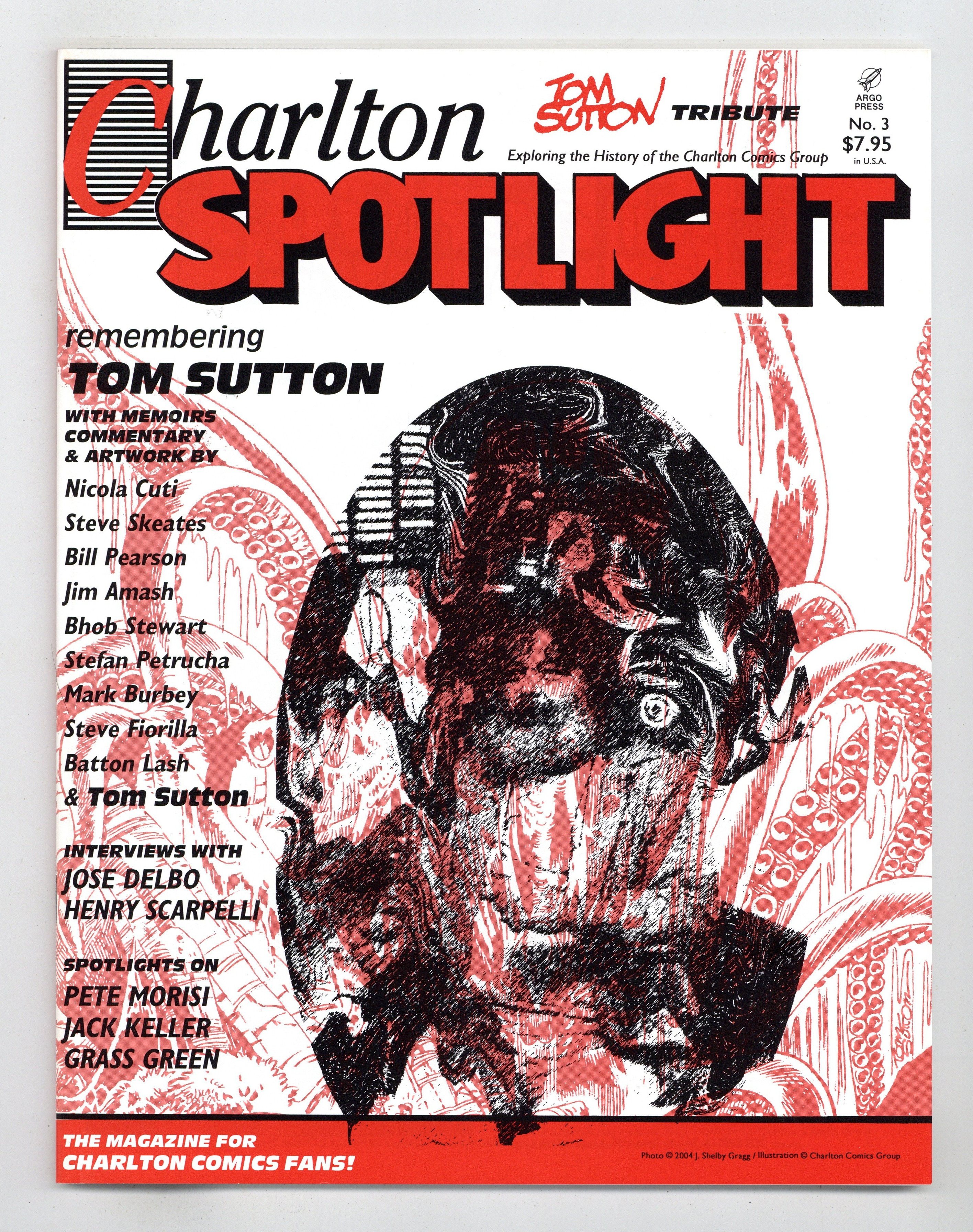 $11.50Printings may vary. This issue pays tribute to the memory of the late, great artist-writer Tom Sutton. Featuring articles and art by Steve Skeates, Nicola Cuti, Bill Pearson, Batton Lash, Jim Amash, Bhob Stewart, Steve Fiorilla and Stefan Petrucha, we explore Sutton's comics legacy? highlighting his critical Charlton Comics years while looking at his work for Warren and other publishers, with many rare, obscure and unpublished photos and illustrations along the way. In addition to some never-before-seen pages from Tom's work on the unpublished sequel to Squalor (from First Publishing), there's also a Charlton-era Sutton interview by Mark Burbey, a complete classic Sutton Charlton story reprint (over Wally Wood layouts!), a detailed checklist of Sutton's Charlton work, and a gallery of his top Charlton covers. Rounding out the issue are interviews with Charlton/Gold Key/DC artist Jose Delbo and Archie artist Henry Scarpelli, plus remembrances of Jack Keller, Grass Green and Pete Morisi. With the usual extensive Charlton checklists and cover galleries, news, reviews, readers departments and more. (Argo Press) Magazine, 72pg, b&w $7.95 Cover price $7.95.