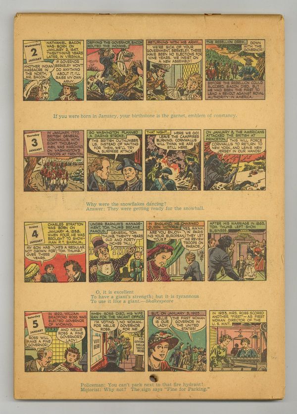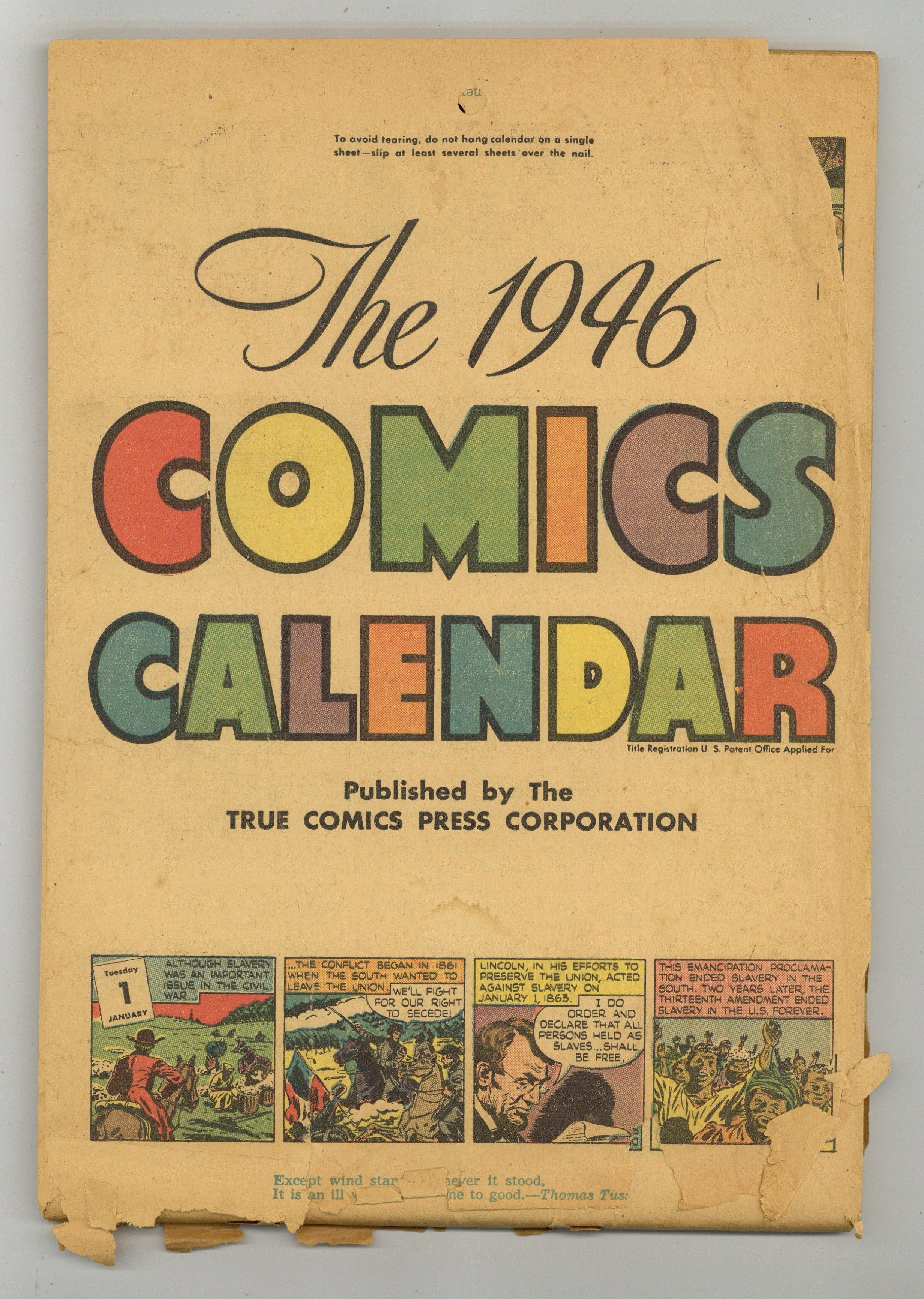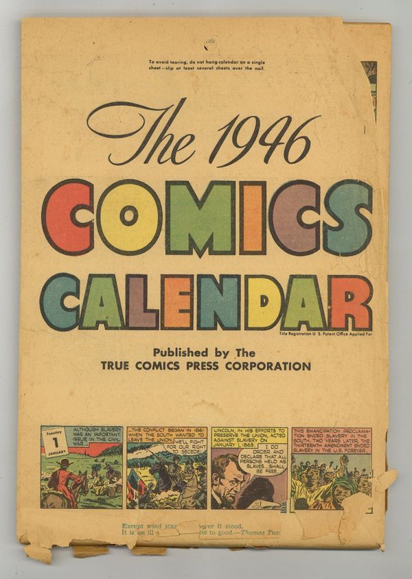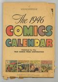 1946 Comics Calendar was published by True Comics Press Corp. Features a full color comic strip for each day of 1946. Also includes a variety of almanac-type information and statistics. 7 3/8" X 10 1/2". 116-pages. Glossy outer cover. Stapled at the top, calendar style. Cover price $0.25.