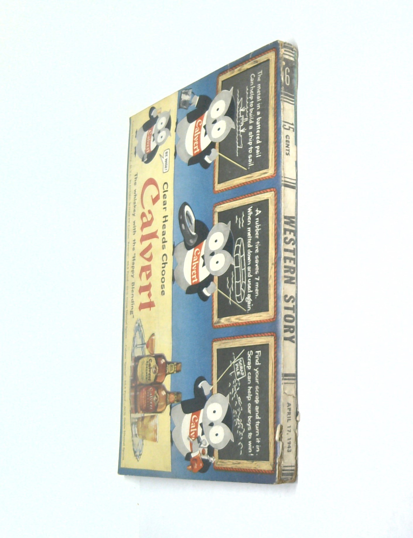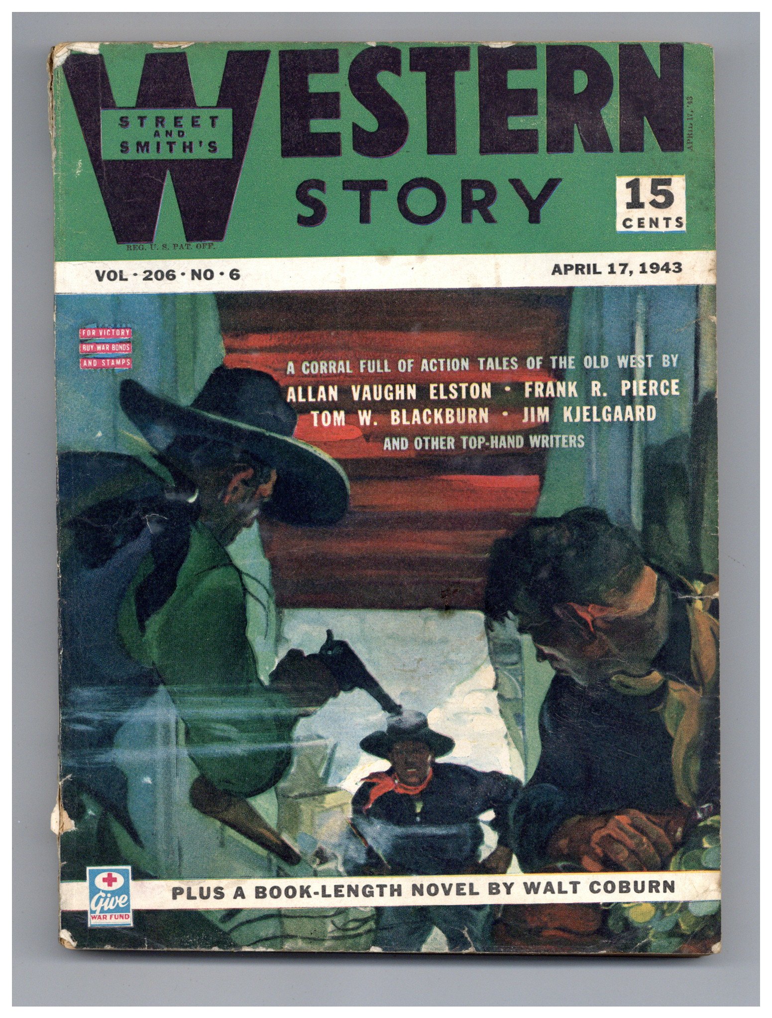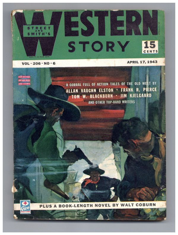 Vol. 206, No. 6 - April 17, 1943. Cover by H. W. Scott. Feature novel "Law Comes to War Bonnet" by Walt Coburn. Serials "The Range FInders" 1/5 by Allan Vaughan Elston and "Man Tracks" conclusion by Bennett Foster. Short stories by Tom W. Blackburn, Frank Richardson Pierce, L. Ernenwein, Hopsburg Liebe, Jim Kjelgaard, and Edwin K. Sloat. 6 3/4-in. x 9 1/4-in.; black and white; 162 newsprint pages. Cover price $0.15.