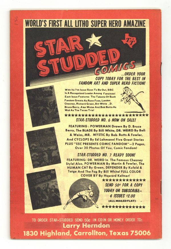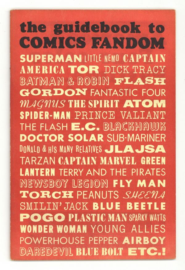 The Guidebook to Comics Fandom (1965) , written/edited by one of the founders of comic book fandom, Jerry Bails, and published by Bill Spicer. Chocked full of information about 1960's comic fandom, including a list of the date and title of all the best Golden Age first edition comics for the true collector's checklist, and a glossary of terms used by collectors and dealer for the layman to begin his journey to becoming an expert in the then-budding field of comic collecting. Filled with ads for other comic fanzines, plus "comics for sale" ads from a few of the earliest comic dealers. The ad for Star-Studded Comics on the back cover was designed by Buddy Saunders who, along with Larry Herndon and Howard Keltner, published most issues of Star-Studded Comics. 36 pages including covers, 5.5-in. x 8.75-in., black-and-white interior.