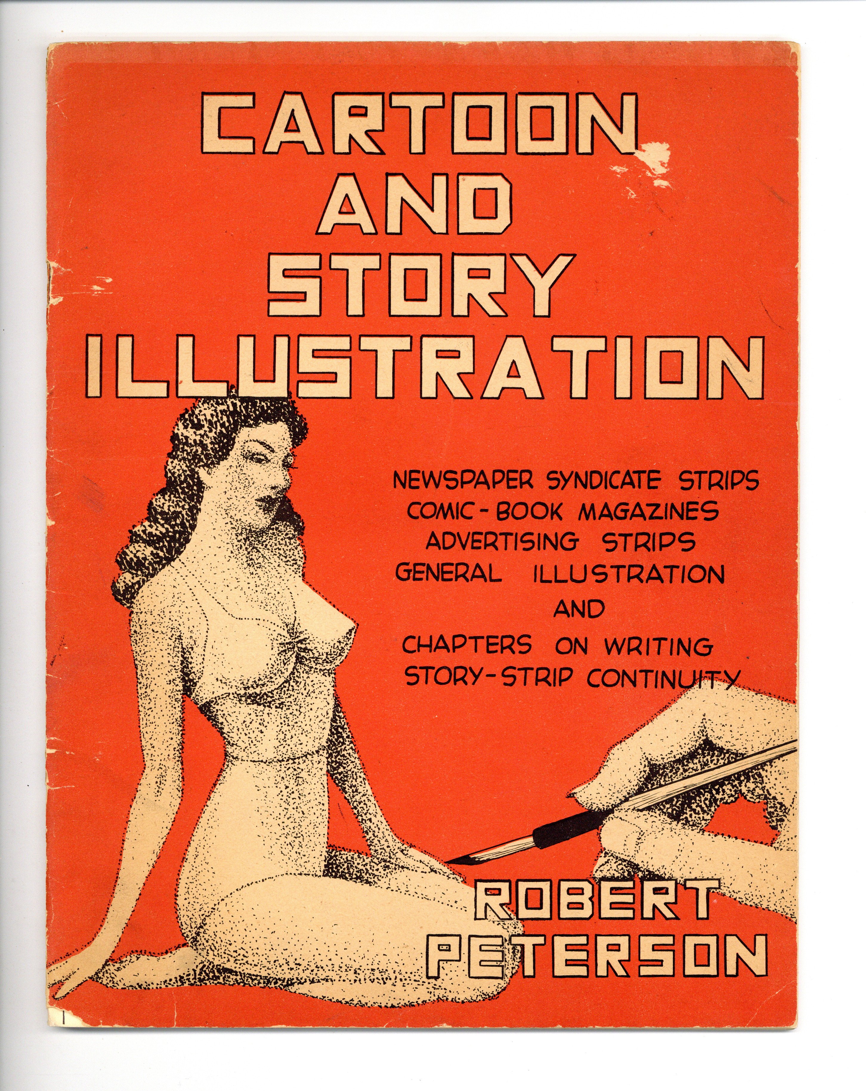 Cartoon and Story Illustration (1945) by Robert Peterson. Published by MSR Publications, New York. Possibly the earlies art instruction publication to deal extensively with the comic book field and to promote comic book illustrating as a profession. Covers scripting, continuity, illustrating, and inking techniques. Includes action adventure, a Tarzan-like page, and costumed hero pages. Five instructional chapters cover: 1) Newspaper Syndicate Strips; 2) Comic Book Magazines; 3) Advertising Strips; 4) General Illustration; and 5) Writing Story Strip Continuity. Robert Peterson (show in a photo at this drawing board) is described as having "had many years experience in the comic field as a writer, artist and editor. From the introduction: "Over 15 million "comic book" magazines are published each month. The comic book field is one of the largest markets in America for the free lance artist and writer, and the stepping-stone to newspaper-strip and advertising illustration, as well as general magazine illustration. There is a lack of writers and artists who can handle this rather specialized work. Consequently, the field is wide open. It is the purpose of this book to teach you how to write comic book continuity if you are a writer, and how to illustrate the continuity if you are an artist, and to open an interesting and profitable new field to you--with the hope that both you and the industry may benefit thereby." We'll never know how many budding artists were influenced by this how to book. Maybe this was the doorway that brought your favorite artist into comics! We can only wonder! Published by MRS Publications, 8.5-in. x 11-in., 52 pages, no cover price.