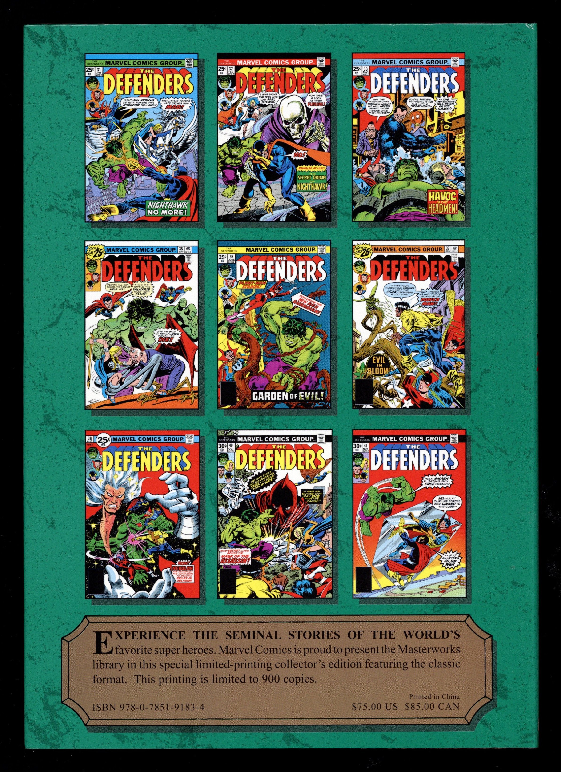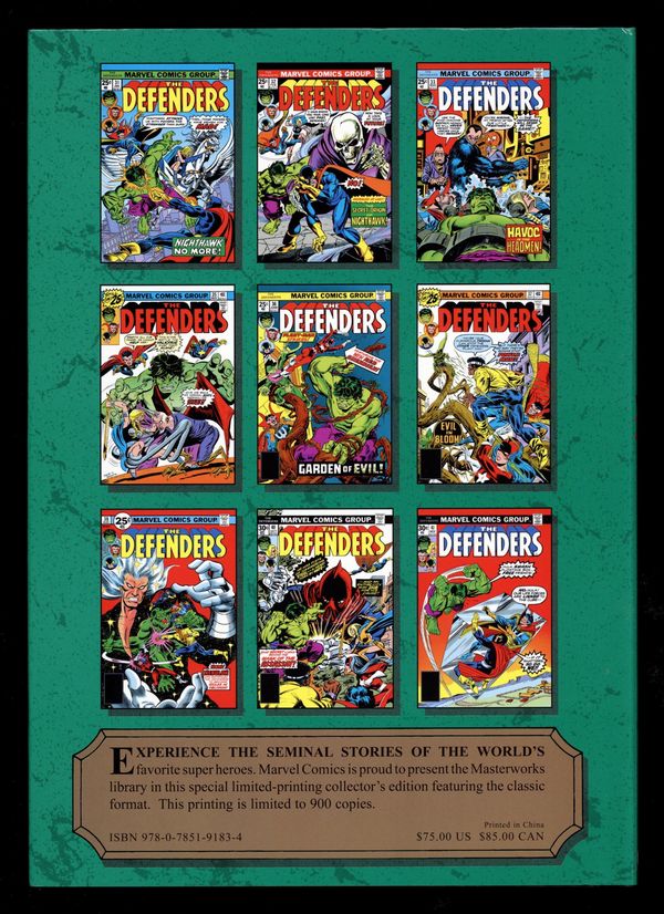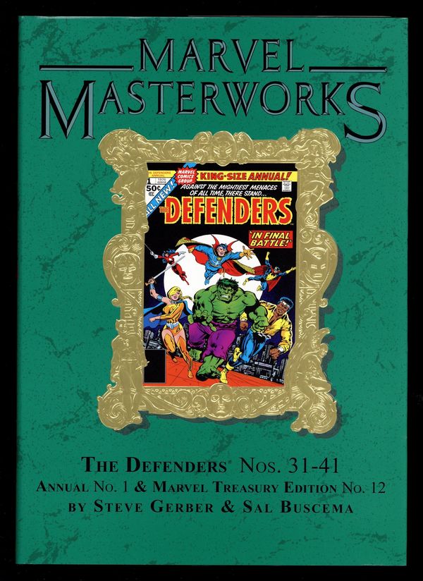 Volume 224 - 1st printing. "Defenders: Book 4!" Collects Defenders (1972-1986 1st Series) #31-41 and ANNUAL #1, and Marvel Treasury Edition (1974-1981) #12. Written by Steve Gerber. Art by Sal Buscema. Cover by Al Milgrom. Steve Gerber's Defenders run comes to its revolutionary conclusion in the latest Marvel Masterworks extravaganza! Gerber consistently broke the boundaries of what a super-hero comic could be, and his Headmen saga stands as one of the high points in a celebrated career. From the Elf With a Gun to Bambi and the Bozos, Gerber wove together an unlikely cast with a challenging critique of the era's culture. His stories would influence a generation of new writers - and with artwork by the stellar team of Sal Buscema and Klaus Janson, Defenders is an indisputable '70s Marvel masterpiece. And we've topped it off with the classic Defenders/Howard the Duck MARVEL TREASURY EDITION team-up. Need we say more? Reserve your copy today! Hardcover, 280 pages, full color. NOTE: Limited to 900 copies. Cover price $75.00.