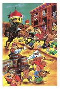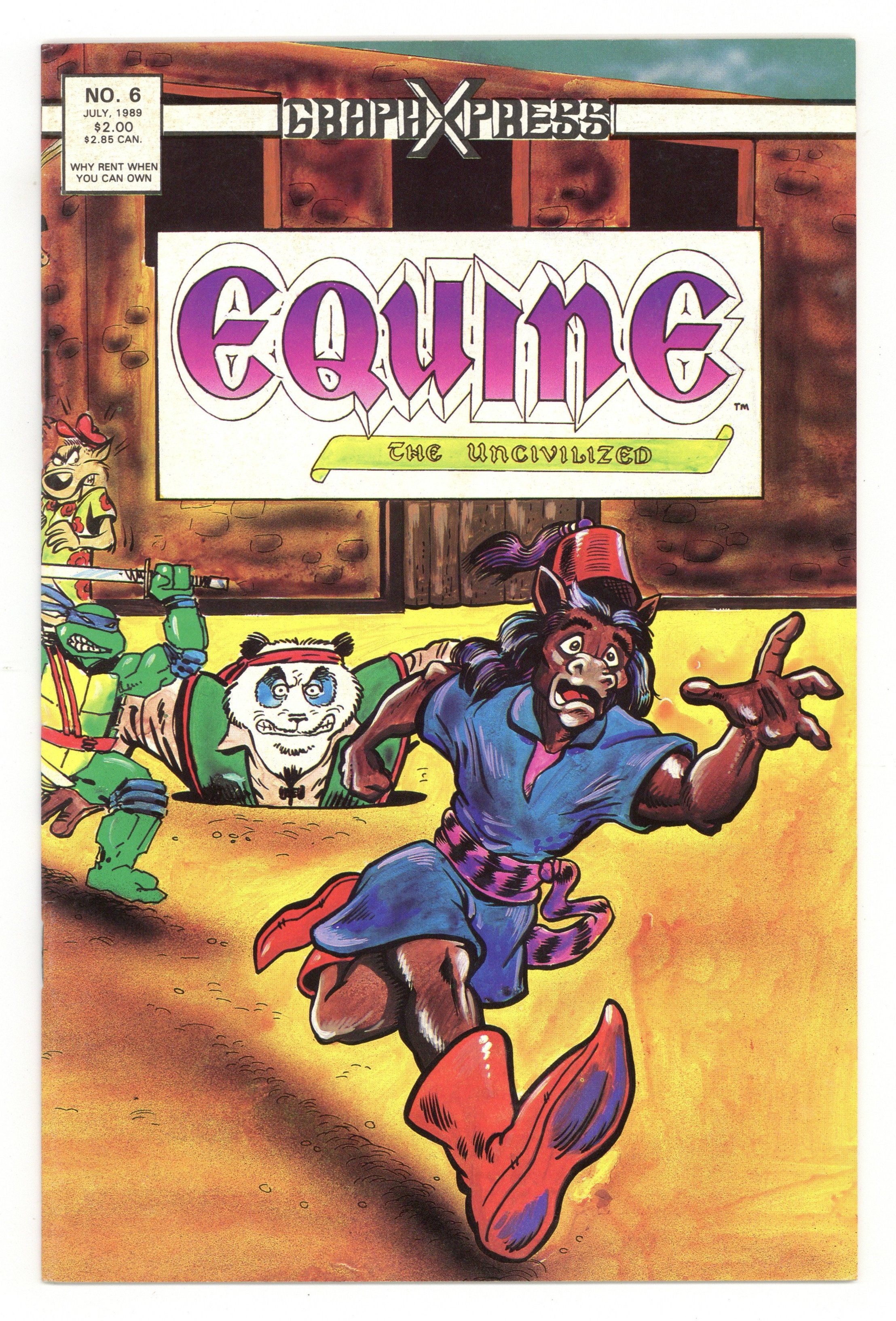 Cover art by Donna Barr, Darin Davis, Dave Garcia, Mike Kazaleh, Kevin Eastman, Peter Laird, Ed Luena, Ken Mitchroney, Beth Mitchroney, Stan Sakai, John Speidel, and Mel White. Painting the Town Orange, script by Richard Konkle, art by Donna Barr, Darin Davis, Dave Garcia, Mike Kazaleh, Kevin Eastman, Peter Laird, Ed Luena, Ken Mitchroney, Beth Mitchroney, Stan Sakai, John Speidel, and Mel White. Equine/Larry transports everyone to a beach to have a party. What he finds is an endless stream of people who want Equine dead. 32 pgs. $2.00. Cover price $2.00.