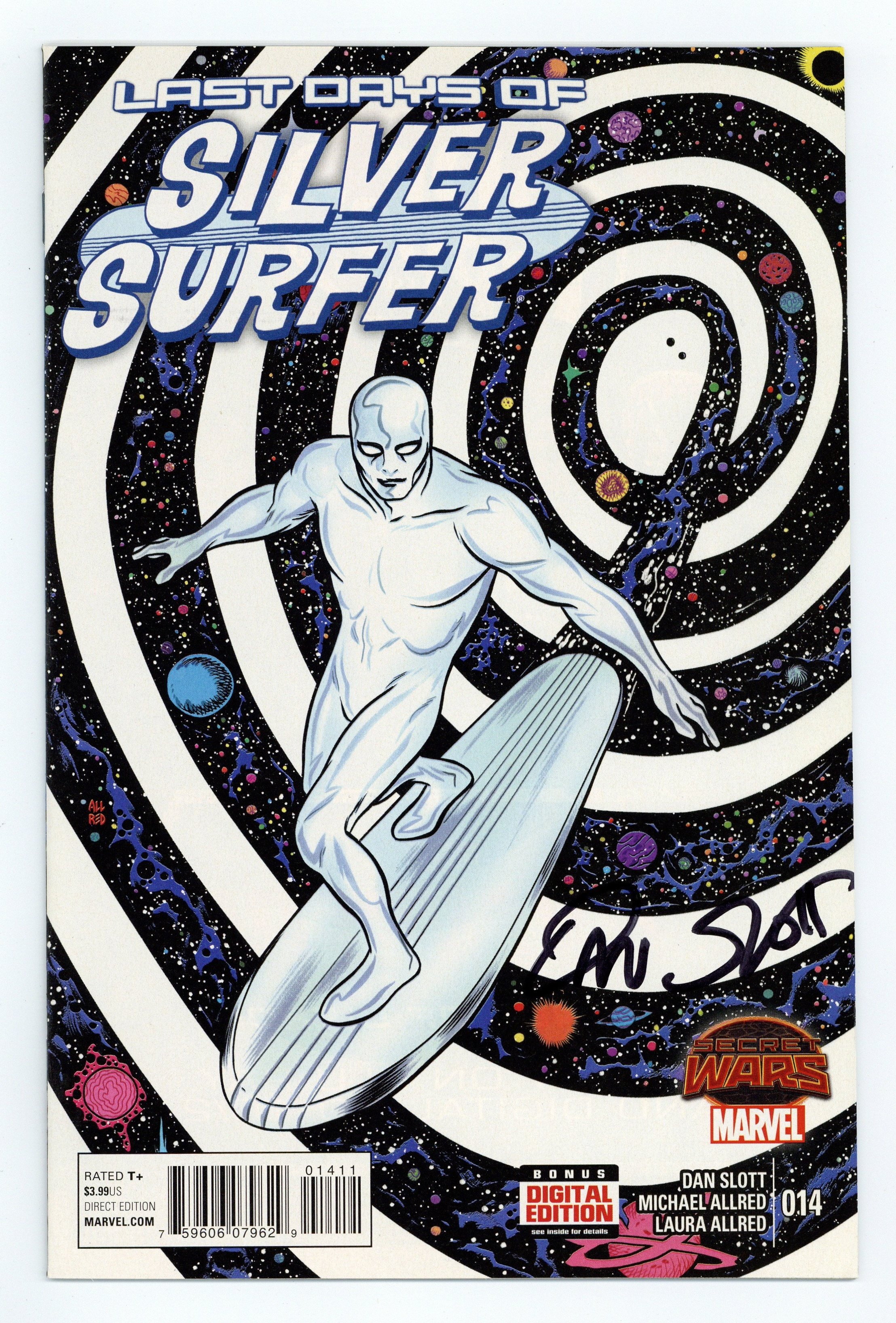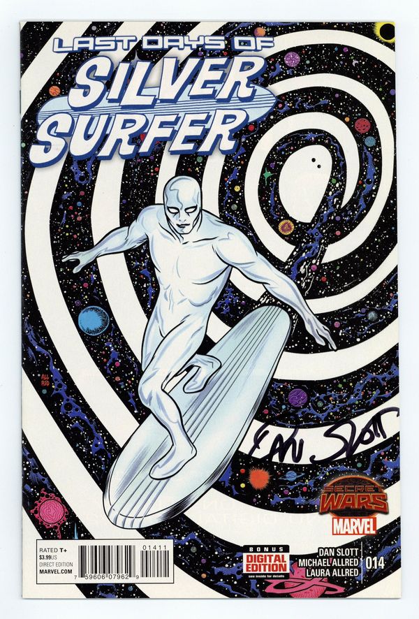 Secret Wars: Last Days - Written by Dan Slott. Art and Cover by Michael Allred. THE LAST DAYS - 'UNIVERSE 2.0' Given unheralded new power, the Silver Surfer is tasked with REMAKING THE ENTIRE UNIVERSE! From the laws of physics to the origins of new life itself, what strange new cosmos will Norrin Radd will into being? Meanwhile, Dawn Greenwood has a far less intimidating task. All she has to rebuild... is Planet Earth. Plus, if the Surfer, Dawn, and Toomie were the only survivors of the previous cosmos to make it into the void... ...why are they not alone?! 36 pages, full color. Rated T+ Cover price $3.99.