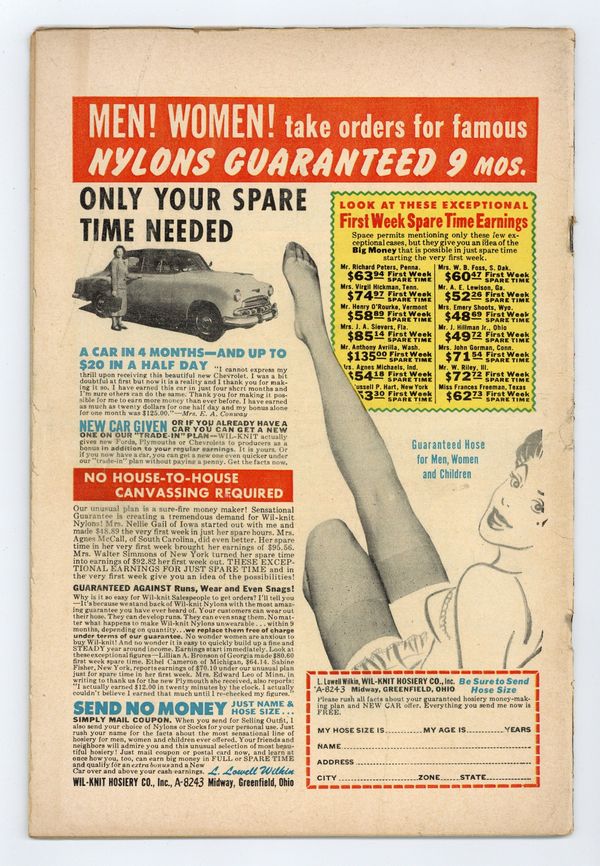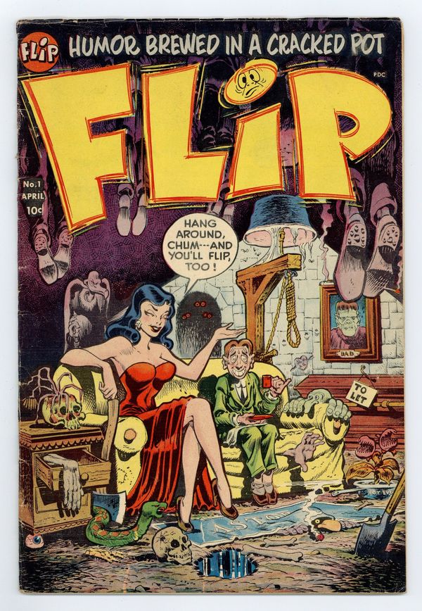 Cover by Howard Nostrand. Stories and art by Howard Nostrand, Nat Barnett and Bob Powell. After the success of MAD, every comics publisher tried their own version of a satire comic with a one-word title, and this was Harvey's. Bandit chieftain Puncho Villa becomes a legend in his own mind as he creates his south-of-the-border empire. A genie in a magic lamp brings new meaning to "Be careful what you wish for." A vampire with a Balkan accent stalks the night. Plus send-ups of contemporary movies, crime and culture. Cover by Howard Nostrand was later selected for the cover of a 2012 anthology, The Sincerest Form of Parody: The Best 1950s MAD-Inspired Satirical Comics. Puncho Villa; Kwikkie Kwizzeroonie; How To See a Bad Movie; Alladin's Lamp-oon; V...- for Wampire; Phony Crime; For the Love of Mike. 36 pages, full color. Cover price $0.10.