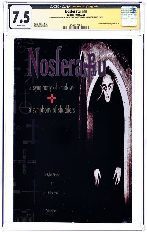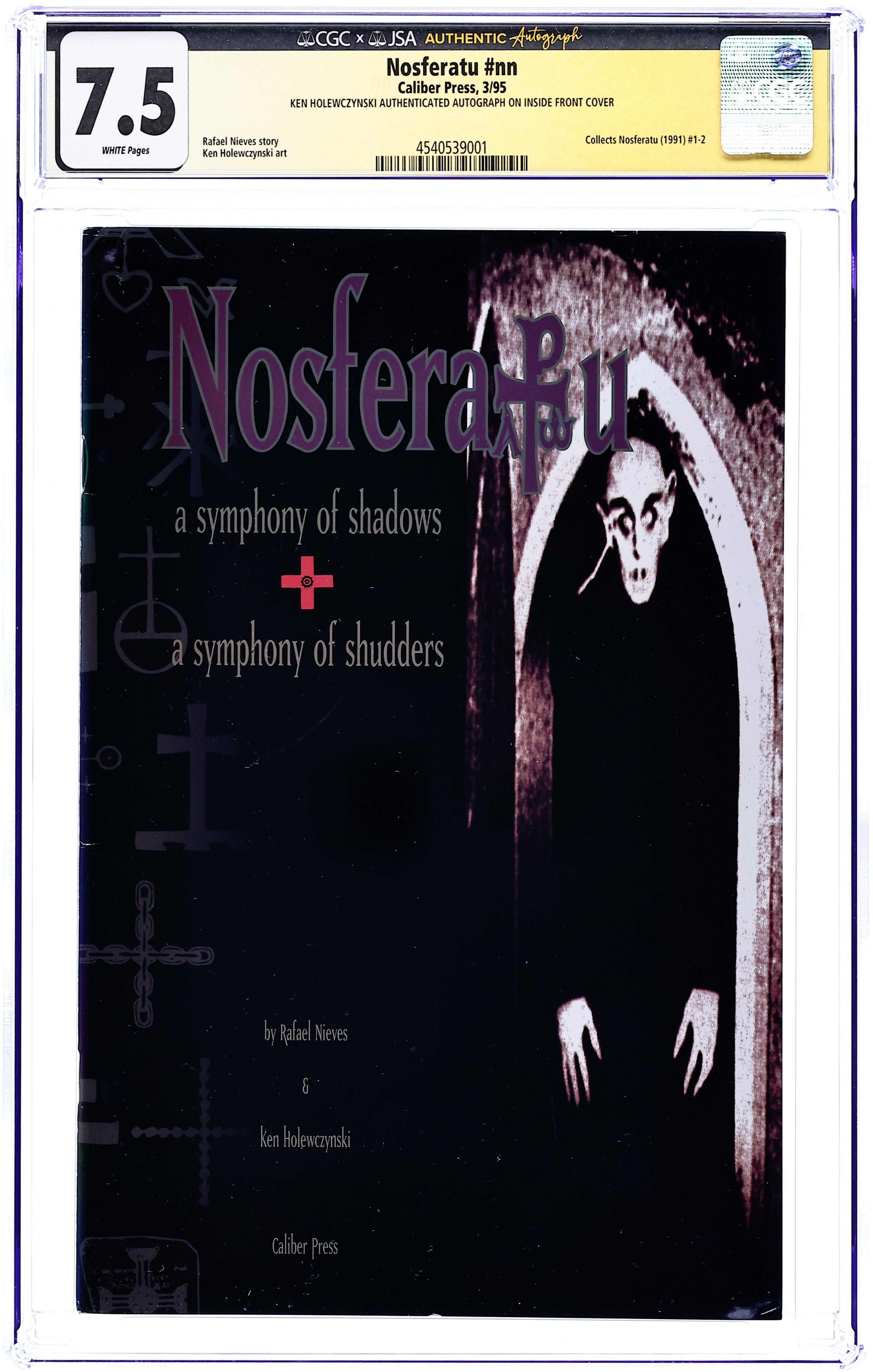 Story by Rafael Nieves. Art and cover by Ken Holewczynski. An adaptation of the classic 1922 F.W. Murnau film, presenting one of the first (and still most effective) cinema vampires. Hapless real-estate agent Johann visits a mysterious count in Transylvania, unaware that his client is a vampire with sinister plans for his city and his young bride, Ellen. Collects the two-issue Tome Press series into one volume. 64 pages, B&W. Cover price $3.95.