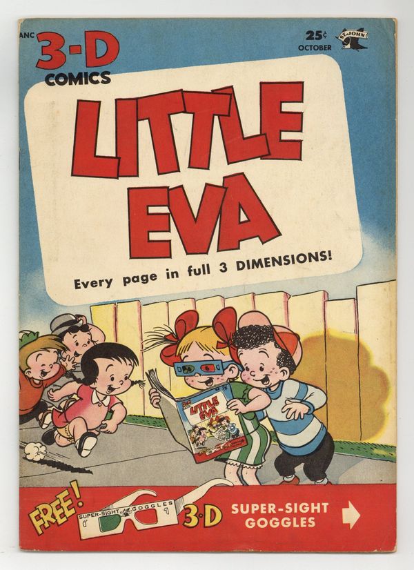 Does not include original 3-D glasses. Mischievous Eva is an adorable counterpart to those other 1950s misadventurers, Little Audrey and Little Lulu. St. John was a pioneer in 3-D comics during the original 3-D craze of the 1950s. When Eva and her friends go camping, it quickly becomes the boys against the girls, until the boys get stuck on an outcropping. Short Stuff accidentally starts a feud with the neighborhood bully. Little Ike has a new way of making mischief when he gets a water pistol. Camping Out; Short Stuff: Bouncing Ball; Little Ike: Pistol-Packin Half-Pint!; Baby Kitten. 32 pages, B/W with 3-D effects. Cover price $0.25.