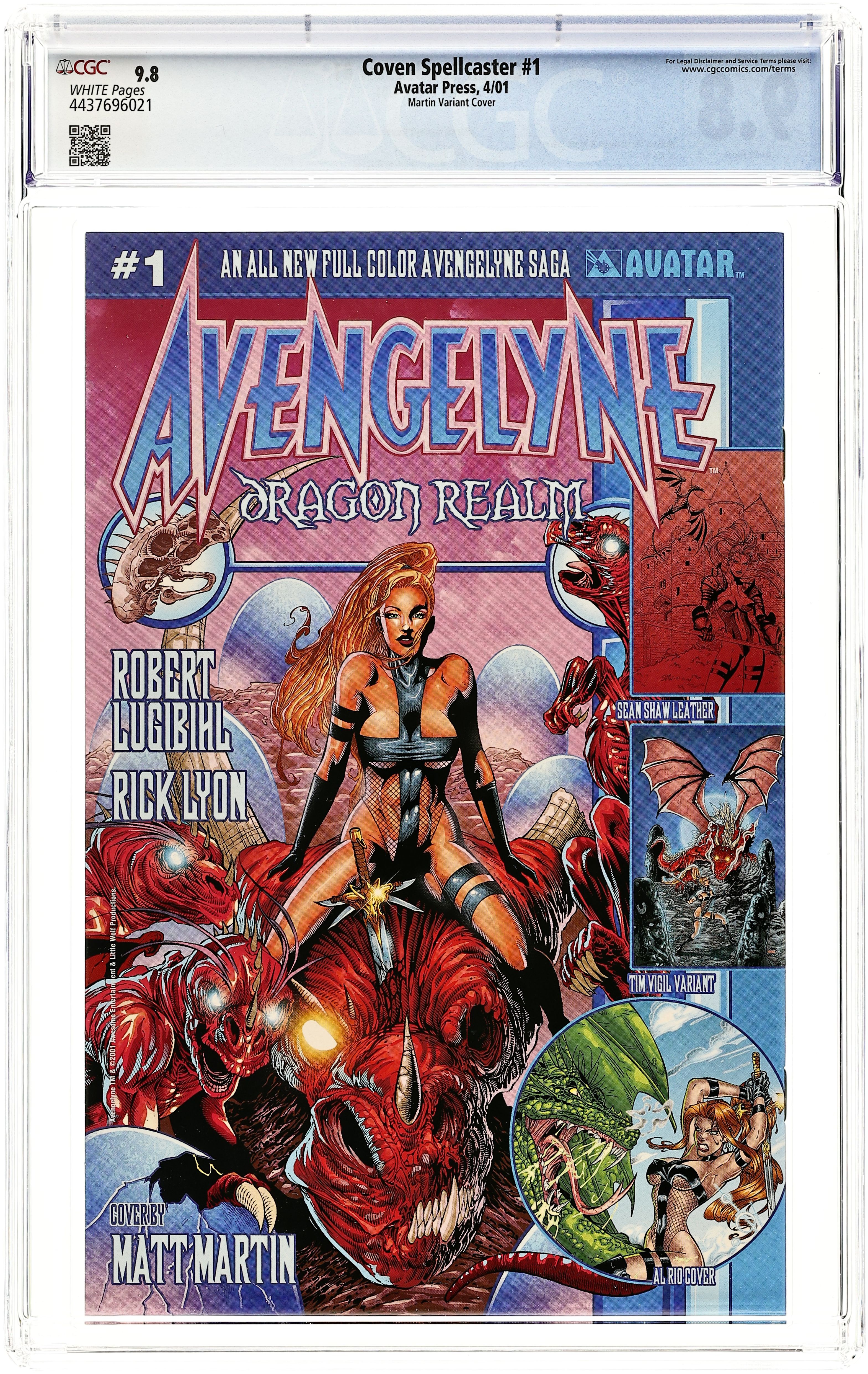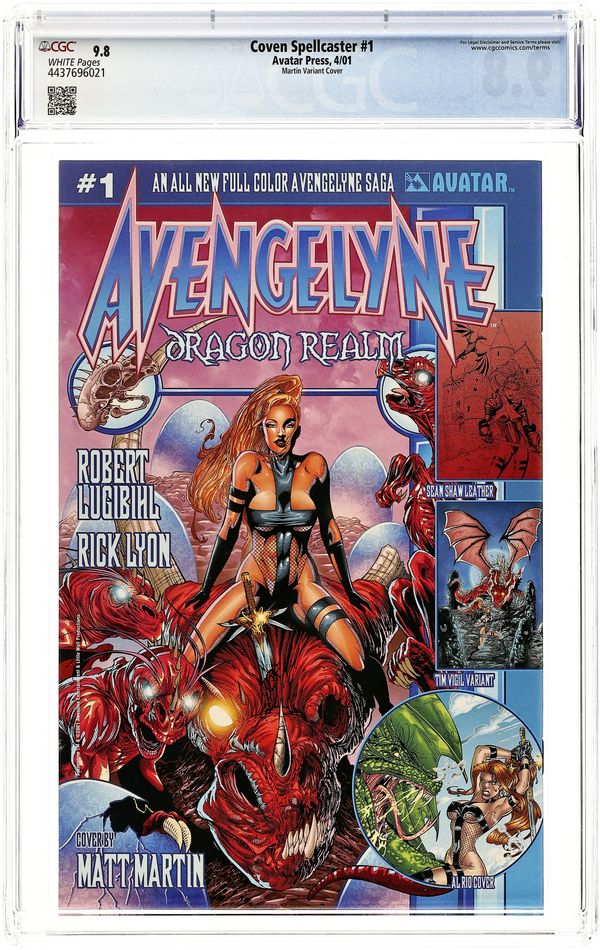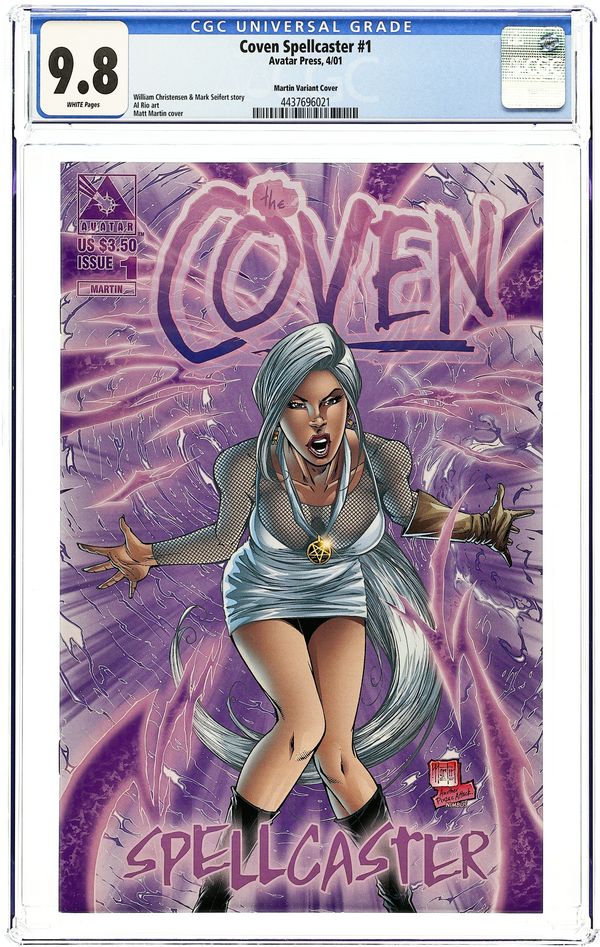 Martin cover at top left. by Al Rio Coven is back, better than ever! The legendary series returns in full color with all new art by Al Rio! Coven was one of the success stories of the late 90s and now Avatar starts to deliver regular Coven material with top talent attached. Al Rio calls these pages the best of his career and Nimbus Studios colors are rich and vibrant. This first issue focuses on the sexy Spellcaster as she must fight the forces of Hell to rescue the soul of her murdered mother. But what if the ruler of Hell has other plans for Spellcaster? A perfect new series for fans of Witchblade and Danger Girl! Covers by David Finch, Al Rio, and Matt Martin. Wraparound cover by Tim Vigil; Leather cover by Matt Martin. Cover price $3.50.