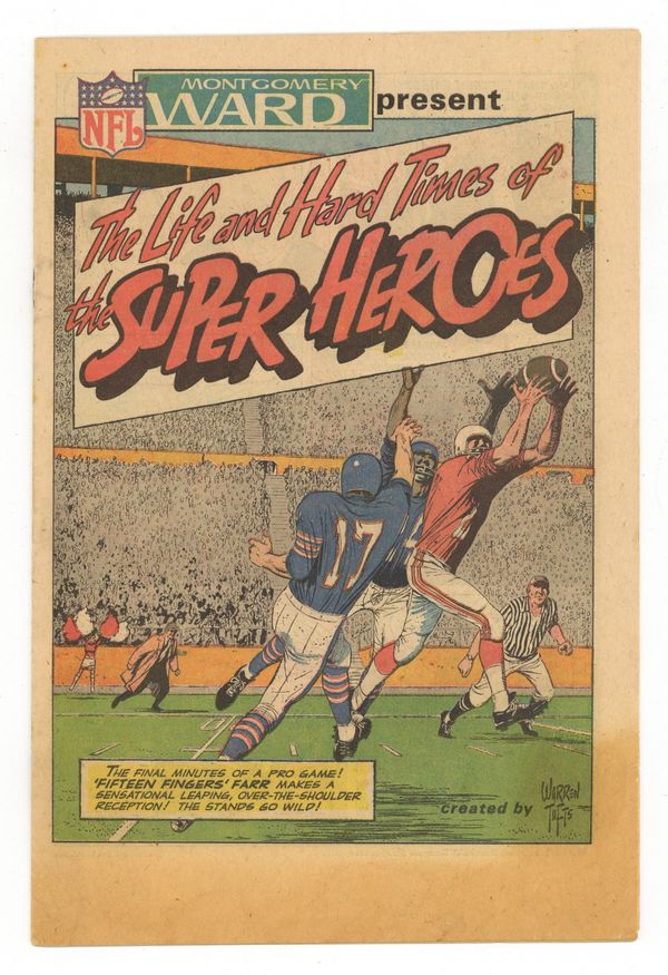 Published 1968 by National Football League.$45.00The Life and Hard Times of Super Heroes (1968) is a promotional comic book distributed Montgomery Ward with a National Football League copyright. Art by Warren Tufts. 16 pages, full color, standard comic book dimensions, all newsprint, no cover price.