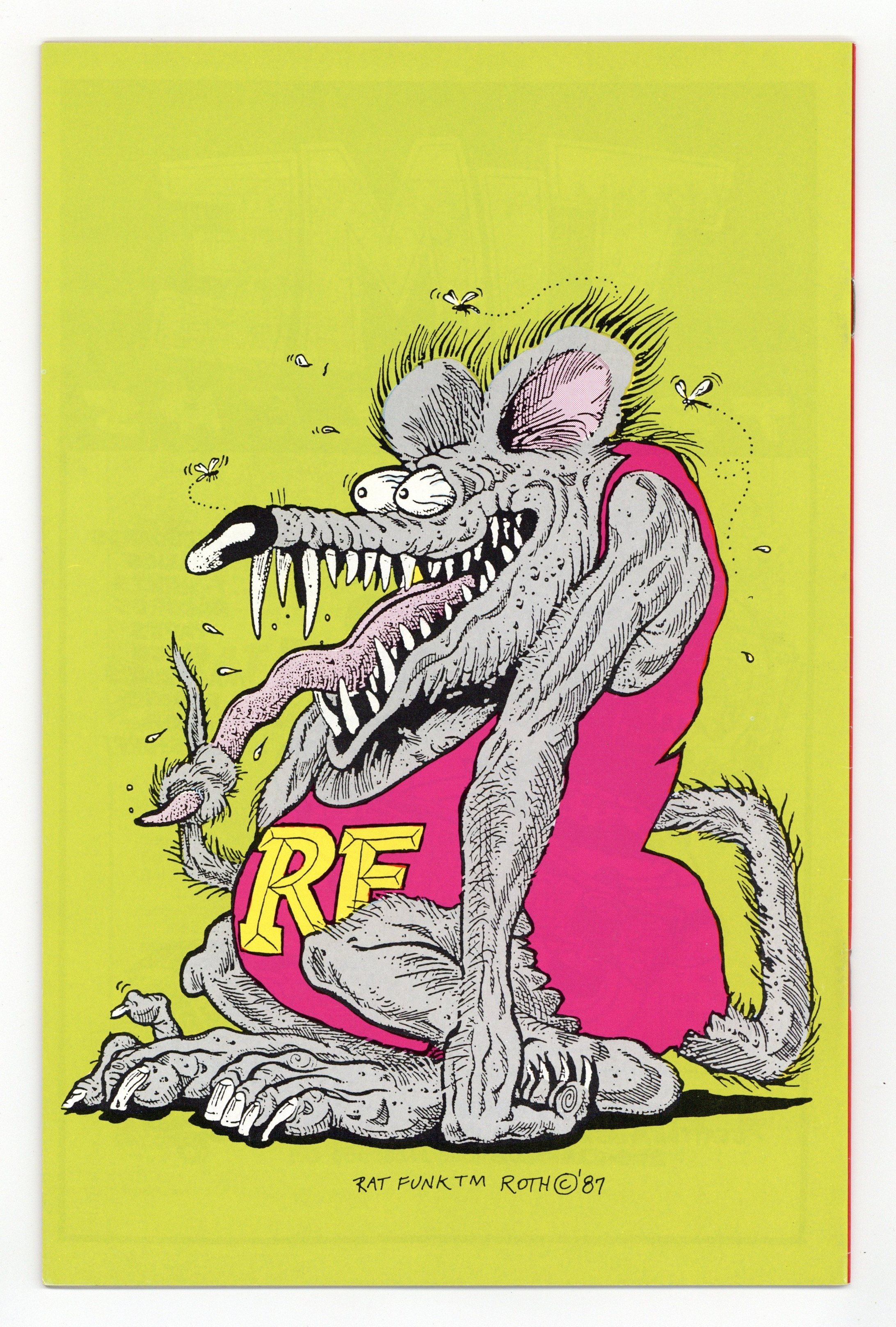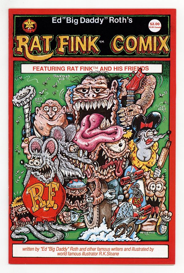 Published 1987 by Starhead Comix.$56.00Stories by Ed Big Daddy Roth, Franco, and Craig Ellis. Art and cover by R.K. Sloane. Rat Fink, the underground anti-Mickey created by legendary car customizer Big Daddy Roth, gets his own comic at last, joined by other such Roth creations as Junkyard Kid, Dirty Doug, Cup Cake, Drag Nut, Rat Funk and Motor Mutt. 32 pages, Full Color. Mature Readers. Cover price $2.00.