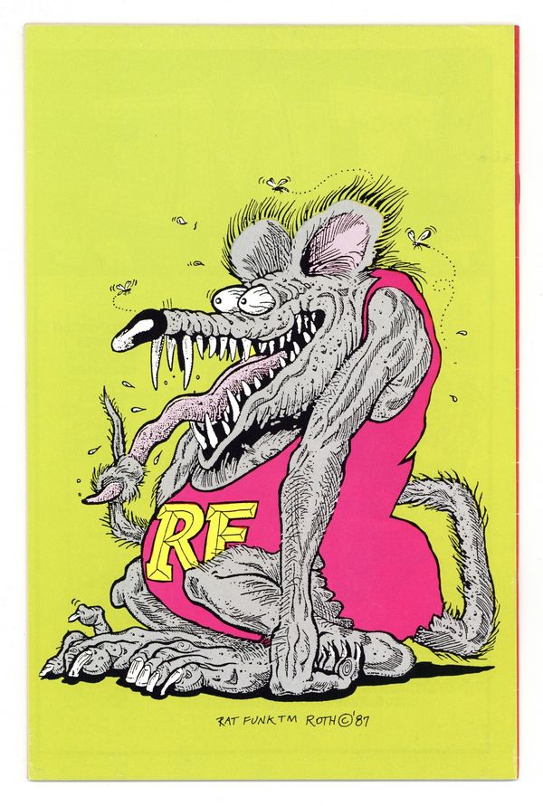 Published 1987 by Starhead Comix.$45.00Stories by Ed Big Daddy Roth, Franco, and Craig Ellis. Art and cover by R.K. Sloane. Rat Fink, the underground anti-Mickey created by legendary car customizer Big Daddy Roth, gets his own comic at last, joined by other such Roth creations as Junkyard Kid, Dirty Doug, Cup Cake, Drag Nut, Rat Funk and Motor Mutt. 32 pages, Full Color. Mature Readers. Cover price $2.00.