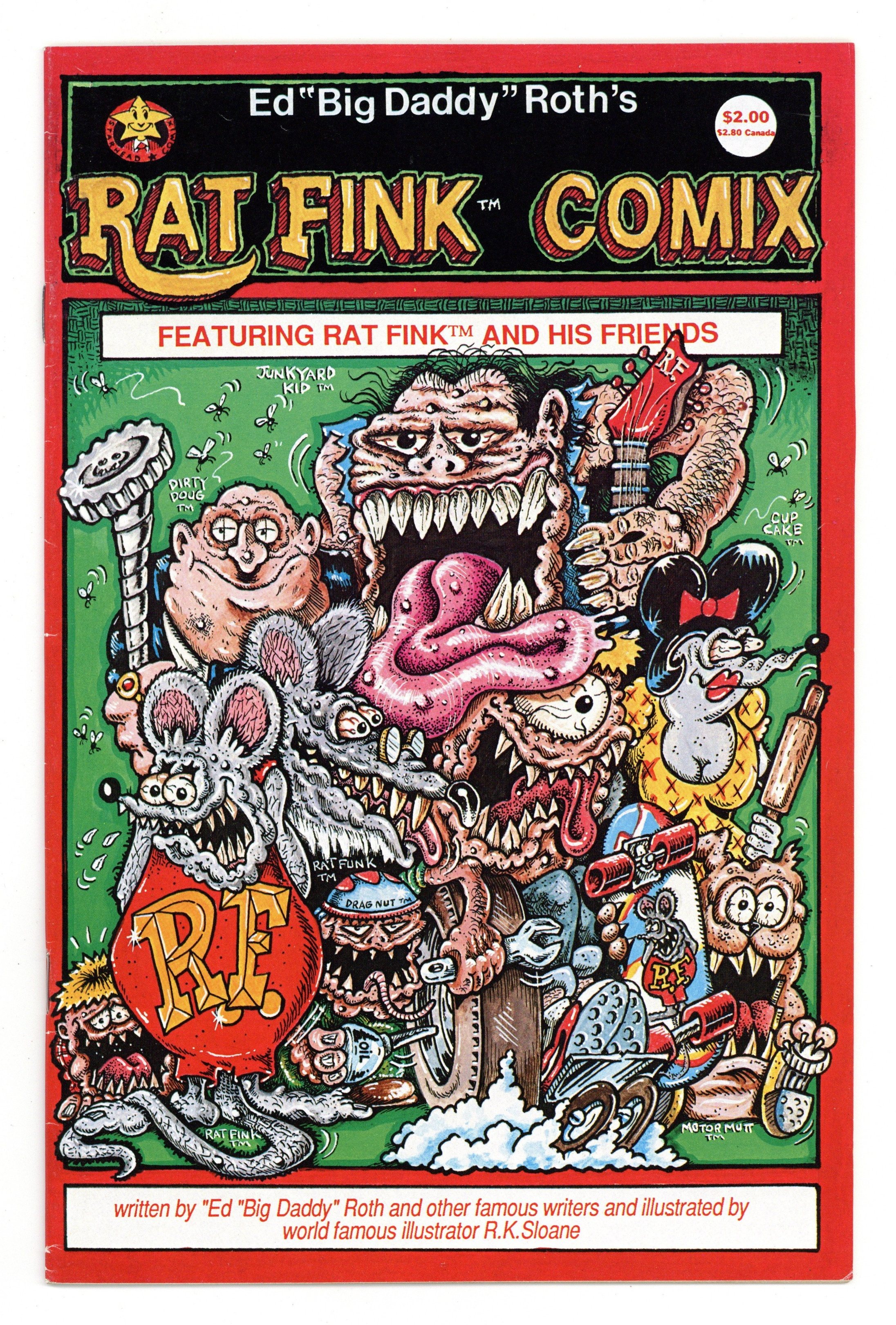 Published 1987 by Starhead Comix.$48.00Stories by Ed Big Daddy Roth, Franco, and Craig Ellis. Art and cover by R.K. Sloane. Rat Fink, the underground anti-Mickey created by legendary car customizer Big Daddy Roth, gets his own comic at last, joined by other such Roth creations as Junkyard Kid, Dirty Doug, Cup Cake, Drag Nut, Rat Funk and Motor Mutt. 32 pages, Full Color. Mature Readers. Cover price $2.00.