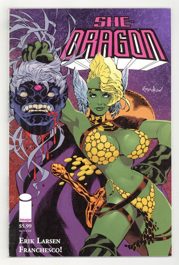 Full color, 48 pages Written by ERIK LARSEN. Art & cover by FRANCHESCO! She-Dragon in her own book at last! Savage Dragon's curvaceous counterpart on her own! Hurled into the dangerous Dimension-X by the diminutive death-dealing dictator known as Mr. Glum, Amy Belcher must fight for her life against dangers aplenty. The ever-sensational She-Dragon fights for survival in a deadly dimension where monsters dwell and creatures are on the loose! She-Dragon has a quest: to get across Dimension-X to Mr. Glum's planet in hopes of finding her way back to Earth. A thousand dangers stand between her and goal, and surprising allies come to her aid. Featuring the malevolent menace of Killmore the Cruel! The return of Savage Dragon's son, Malcolm Eugene Jackson Dragon! And the awe-inspiring art of FRANCHESCO! As a special bonus: a sneak peek behind the scenes featuring a look at creator ERIK LARSEN's layouts for this pulse-pounding project! No SAVAGE DRAGON fan should be without it! Cover price $5.99.