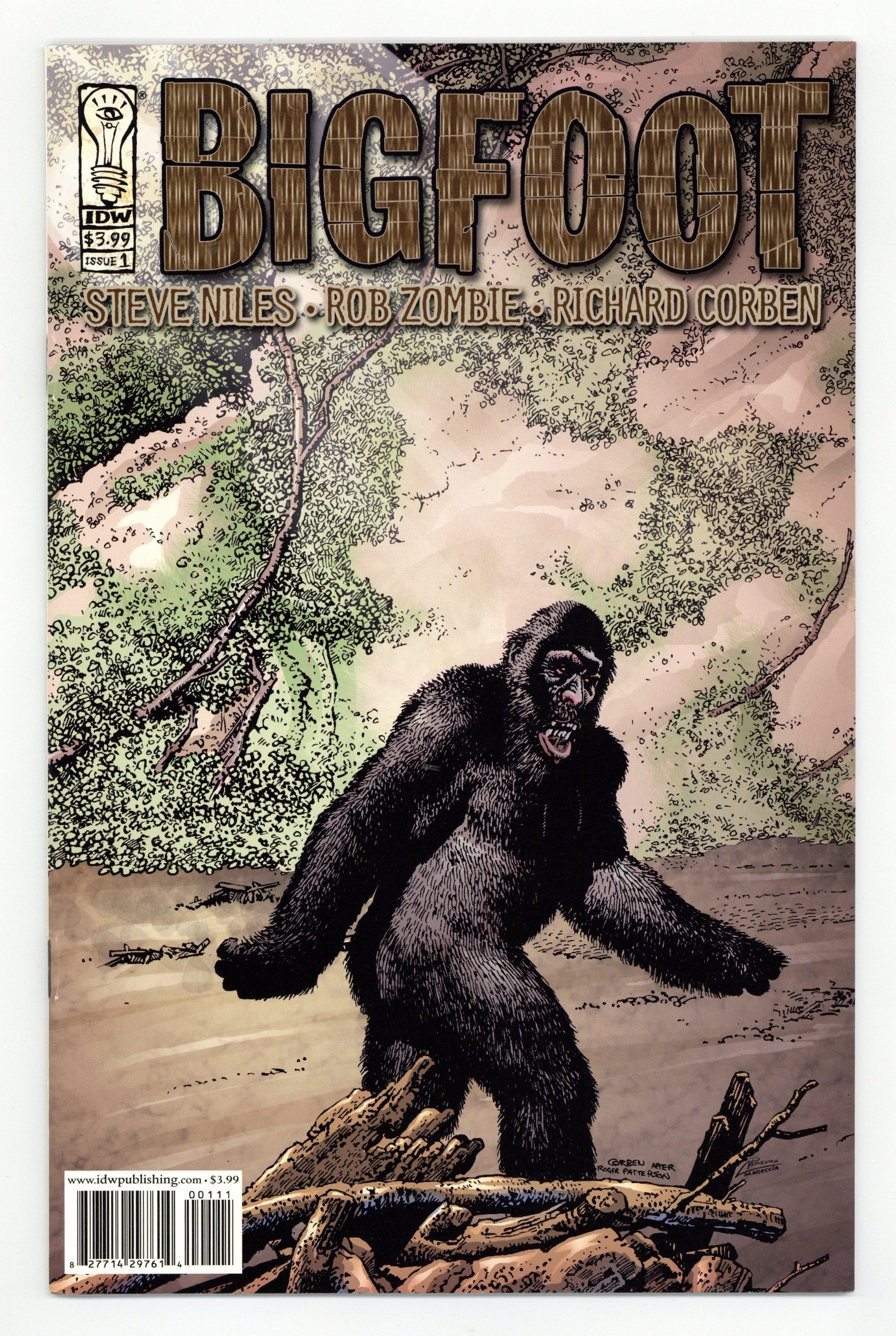 Published Feb 2005 by IDW Publishing.$23.00BIGFOOT #1 by Steve Niles, Rob Zombie& Richard Corben Steve Niles and his fellow Creep, rocker Rob Zombie, team up to present this realistic take on the legendary Bigfoot. A monstrous ape-man is stomping around the woods of the Pacific Northwest, and he's not happy with mankind. Bigfoot also offers master craftsman Richard Corben a return to his true horror roots as he fully renders the imposing beast as only he can. Niles. Zombie. Corben. Bigfoot. What else needs to be said? 32pgs, FC (1 of 4) SRP: $3.99 Cover price $3.99.