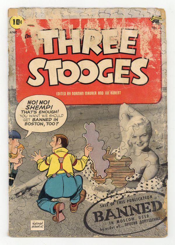 Cover by Norman Maurer. Stories and art by Norman Maurer and Joe Kubert. St. John, a pioneer of celebrity comics, puts Moe, Larry and Shemp on the four-color page. The Stooges are hired to run a creepy old mansion, but hillbilly squatters decide to scare them out of the house by dressing like ghosts. A parody of the comic strip Bringing Up Father features a script by comics legend Joe Kubert. Con man Benedict Bogus somehow gets roped into getting married for real, and only the Stooges can get him out of it. The Stooges go to work at a barber shop, and hair hilarity ensues. And an ad for the "Scholart Institute," one of Kubert's first attempts at comics art instruction, preceding the Joe Kubert School by two decades. Fluke Spook; Saggy and Figgs: Bringin' Up Mamma; Bogus Takes a Bride; The Three Stooges. 32 pages, Full Color. Cover price $0.10.