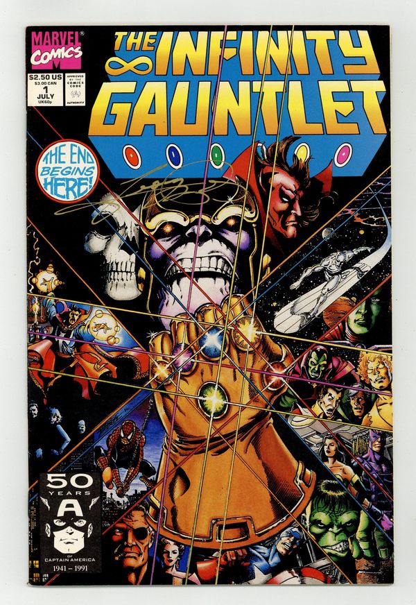 Heroland Comics Gold Signed Stamped Edition. Signed by penciler George Perez in Gold Ink with Thanos stamp on the back cover. May or may not include the original letter of authenticity issued from Heroland's comic book shop, please see individual listings.