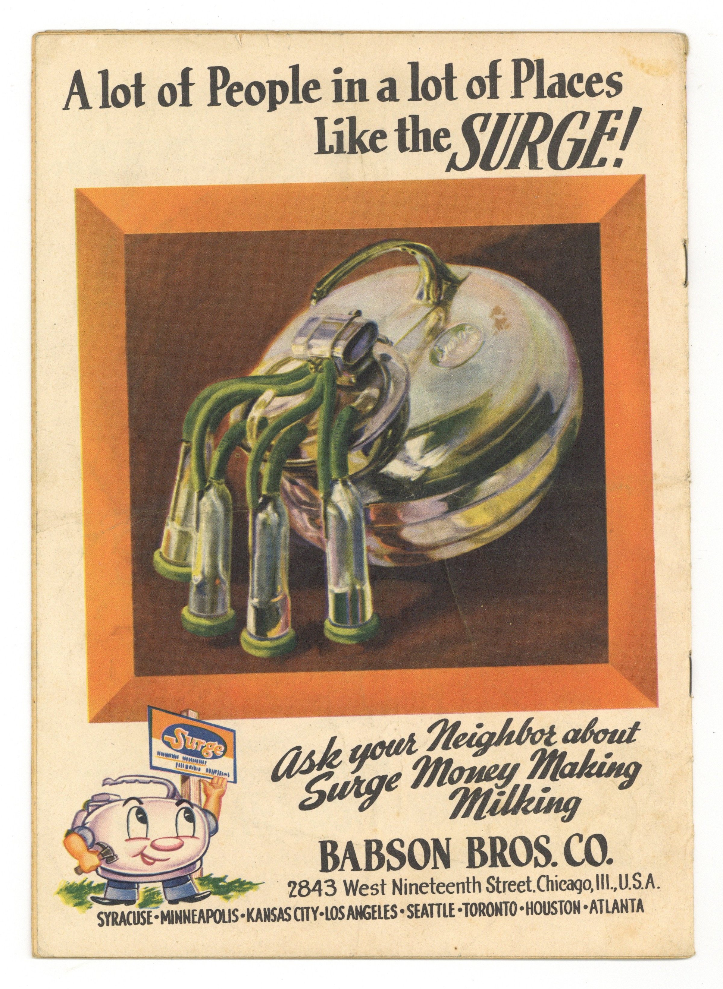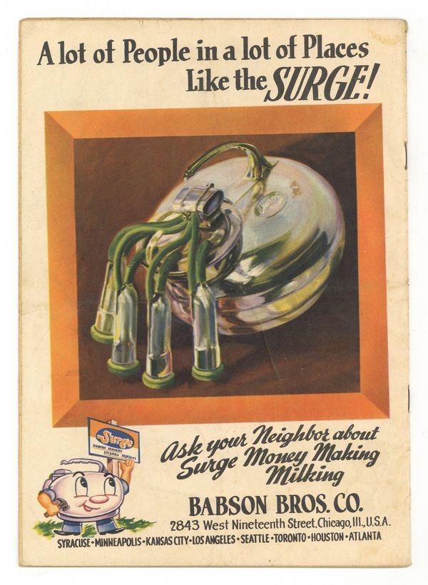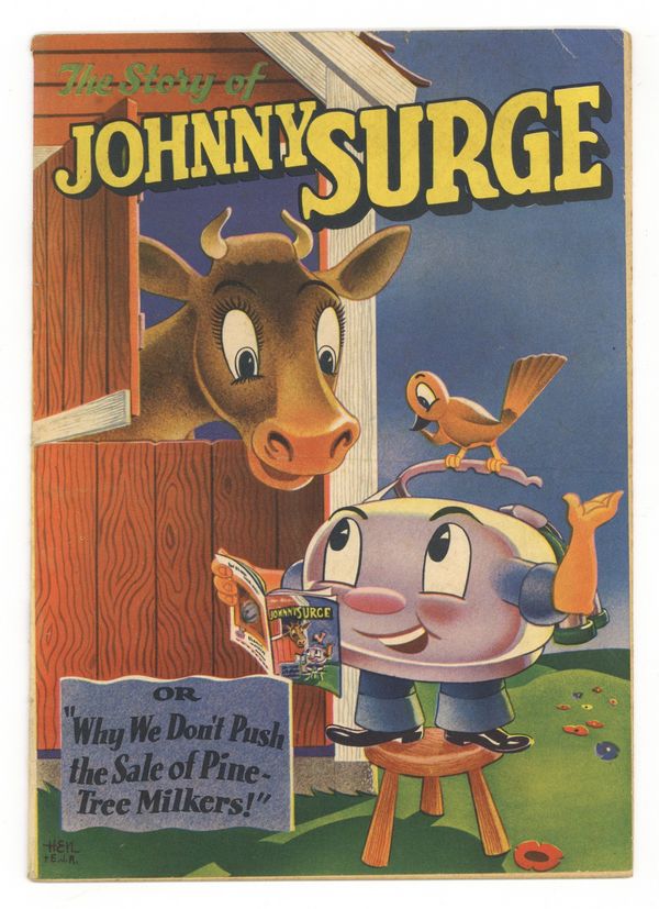 Tags: Infinity CoversPublished 1947 by Babson Bros..$48.00The Story of Johnny Surge, or Why We Don't Push the Sale of Pine Tree Milkers (1947), features an infinity cover, and is a promotional comic book distributed by Surge Farm Dealers to dairy farmers seeking better milk production from their herds. This promotional comic book has been featured in Comic Book Marketplace magazine. 16 pages, full color, 7-in. x 10.25-in., newsprint, with no cover price.