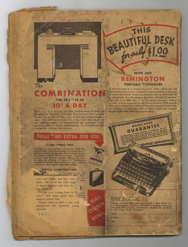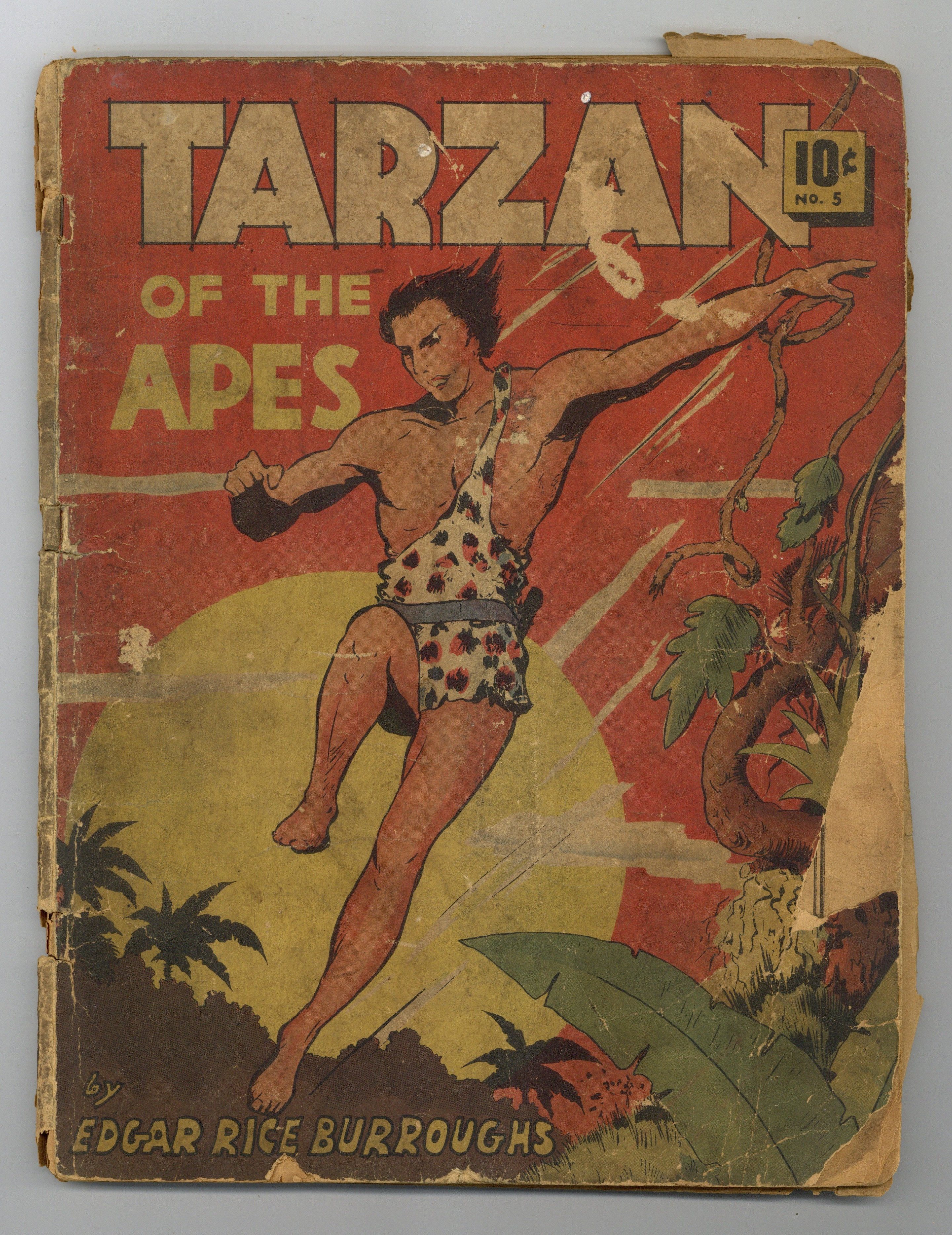 Stories and art by Hal Foster and Henry E. Vallely. Dell's Large Feature Comic reprinted classic comic strips. This issue reprints the very first Tarzan daily comic strips from 1929, a direct adaptation of Edgar Rice Burroughs' first Tarzan novel, Tarzan of the Apes. The art is by future Prince Valiant creator and comics legend Hal Foster, with new art for this volume by illustrator Henry E. Vallely. The son of shipwrecked Lord and Lady Greystoke is born while they are marooned in the African jungle. Raised by a tribe of apes, he becomes the legendary wild man Tarzan. Years later, when he encounters Jane and her party in the jungle, he reconnects with his human past and hears the call to adventure. 8 1/2-in. x 11 1/2-in, 72 pages, B&W. Cover price $0.10.
