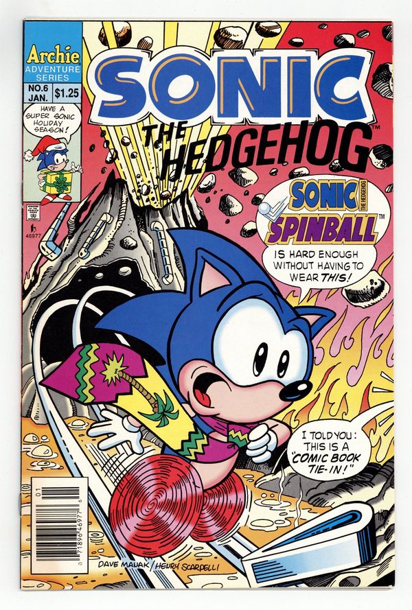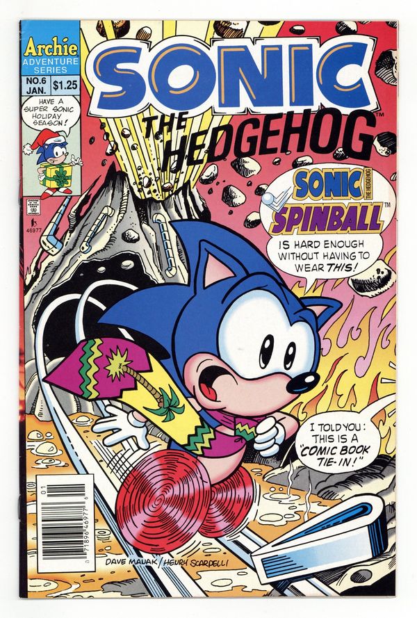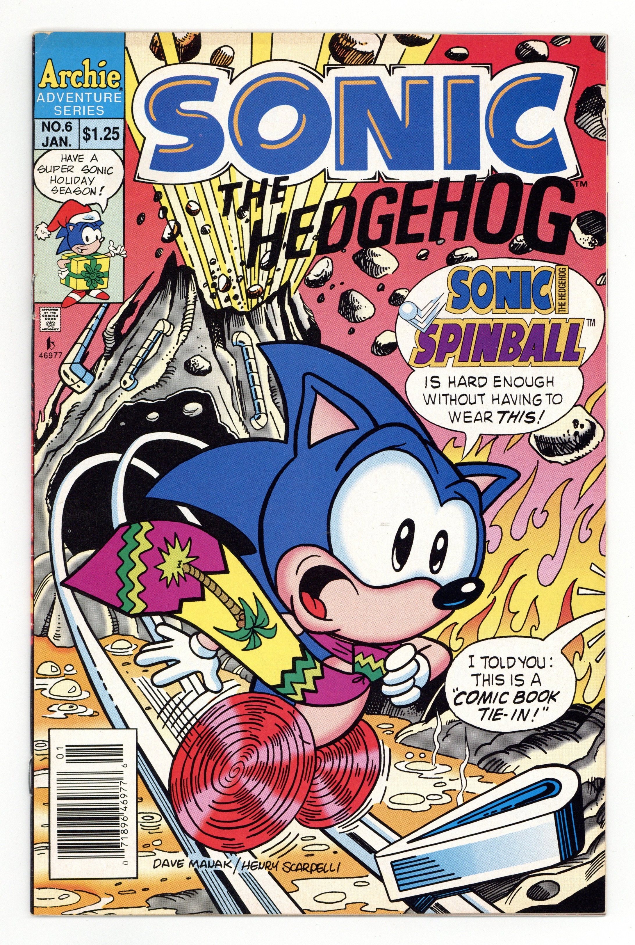 Published Jan 1994 by Archie Publications.$36.00Cover pencils by Dave Manak, inks by Henry Scarpelli. The Spin Doctor, script by Michael Gallagher, pencils by Dave Manak, inks by Henry Scarpelli; Sonic invades Dr. Robotnik's volcano fortress to stop his latest scheme. Here Comes The Bribe, pencils by Manak, inks by Scarpelli. Sonic's Christmas Carol, script by Angelo DeCesare, pencils by Manak, inks by Henry Scarpelli; A retelling of the Dickens classic, Sonic style. Inspired by the Sega Genesis videogame. 36 pgs. $1.25. Cover price $1.25.