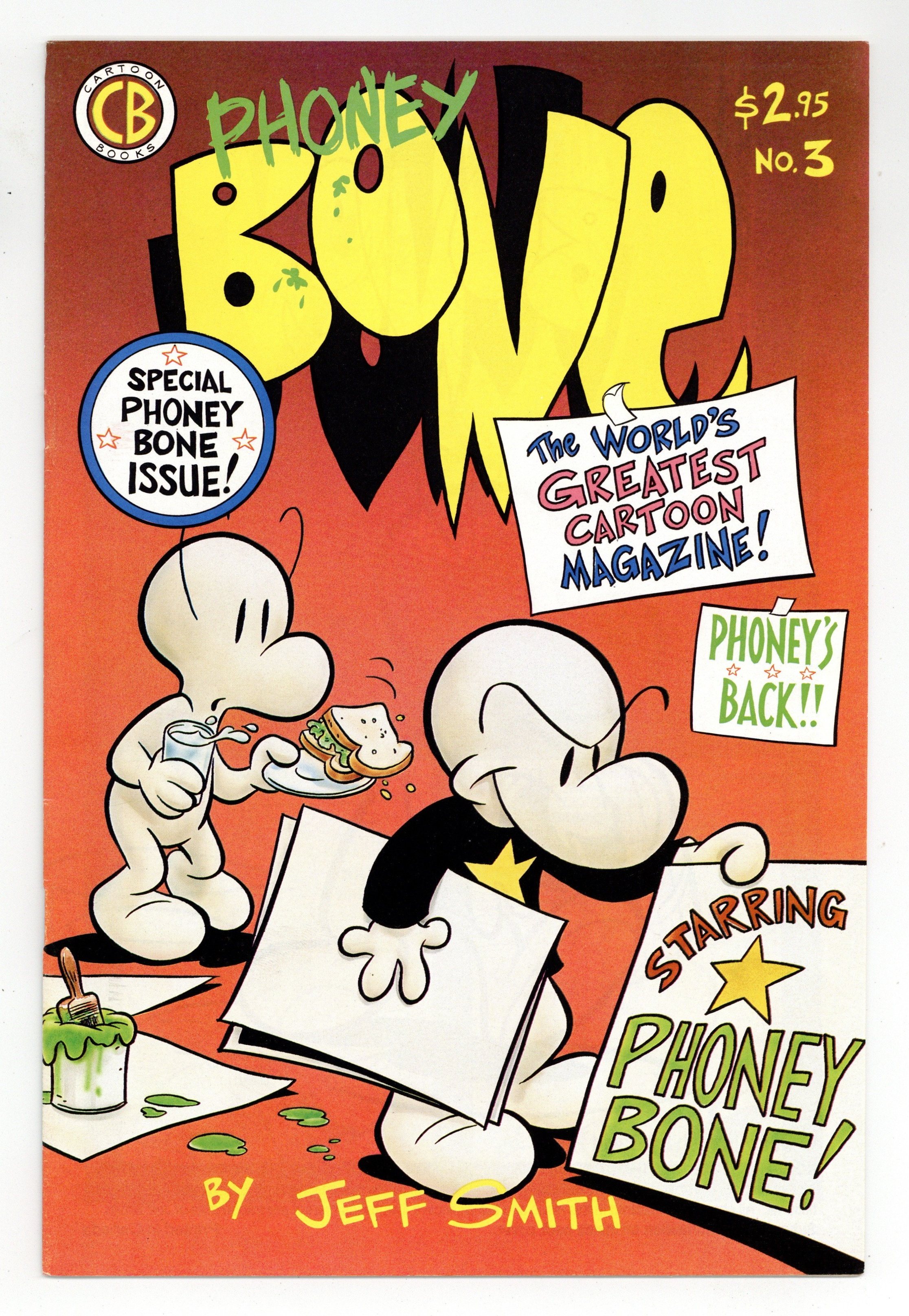 Cover art by Jeff Smith. "Grump! Grump! Grump!", script and art by Jeff Smith; Grandma Ben returns from Barrelhaven and Phoney Bone and Bone reunite. This is a first printing. Most issues from #1-12, and possible some beyond, have been reprinted. Reprints may be identified by a 2nd, 3rd, 4th, 5th, etc. printing notice inside the comic. 28 pgs. $2.95. This is a first printing. Most issues from #1-12, and possible some beyond, have been reprinted. Reprints may be identified by a 2nd, 3rd, 4th, 5th, etc. printing notice inside the comic. Cover price $2.95.