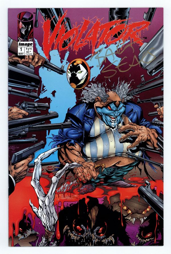 Ends May 4 9:58 PM CST Bid History 1 bid Current Bid $1 Your Secret Max Bid If you'd like to bid, please log in or register. Direct Edition. Cover pencils by Bart Sears, inks by Mark Pennington. "The World, Part 1 of 3," script by Alan Moore, pencils by Bart Sears, inks by Mark Pennington; Violator's brothers (Vacillator, Vindicator, Vandalizer and Vaporizer) come to Earth to kill Violator; Mobsters hire Admonisher to kill Violator. Behind the Scenes article by Terry Fitzgerald, pencils by Alan Moore and Bart Sears. 36 pgs., full color. $1.95. Cover price $1.95.
