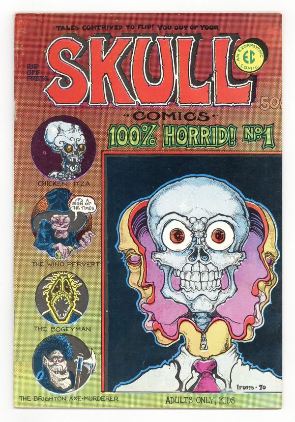 Published Mar 1970 by Rip Off Press/Last Gasp.$34.001st printing. Stories and Art by Greg Irons, Dave Sheridan, Jack Jackson, Fred Schrier, and Rory Hayes. Classic Underground Horror/Humor comic inspired by classic EC Comic Tales. 7-in. x 10 1/4-in., 36 pages, B&W, MATURE READERS NOTE: Printing Very Difficult to determine. 1st and 2nd Printings have a printing defect on Story Page 7 of the story "The Answer" (pg15) in which the word "Decadence" is partially covered. This is Corrected in the 3rd Printings. Further, 1st Printings are slightly taller than 2nd printings, and the art on issue pages 20-29 is tilted due to incorrect printing alignment of 1st Printings. Cover price $0.50.