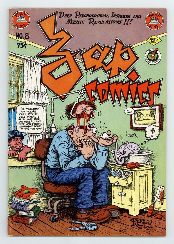 1st Printing, $0.75 cover price. Robert Crumb cover. Art and stories by Robert Crumb, S. Clay Wilson, Robert Williams, Spain Rodriguez, Gilbert Shelton, and Victor Moscoso. 52 pages, B&W Cover price $0.75.
