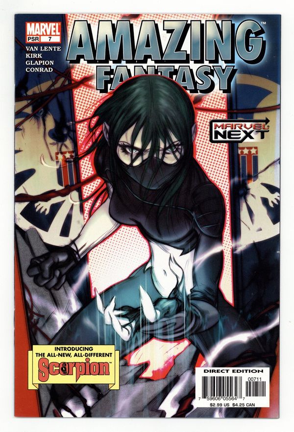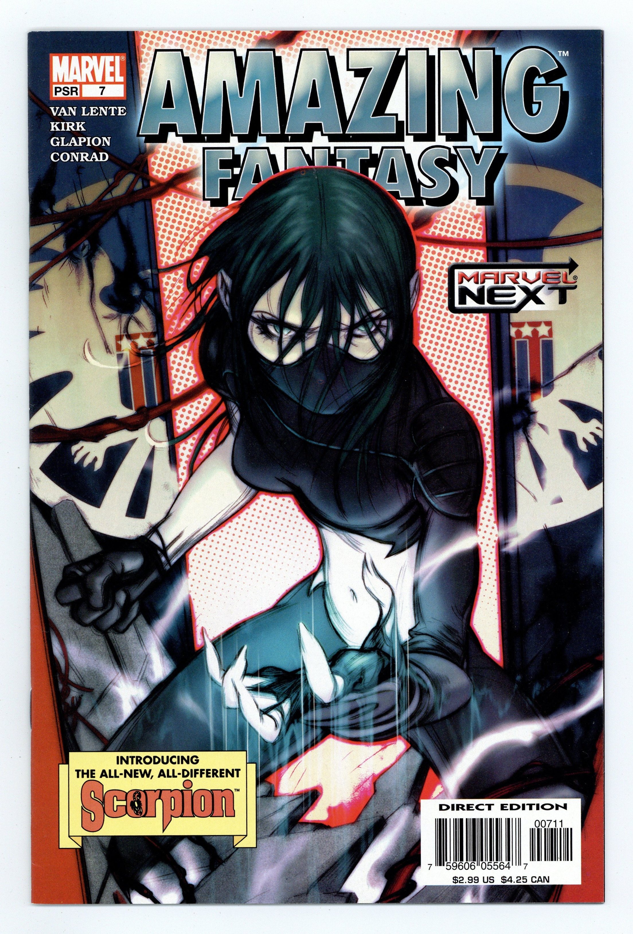Direct Edition. Written by FRED VAN LENTE Penciled by LEONARD KIRK Cover by JAMES JEAN The fans spoke and Marvel listened. The winner of the Marvel.com poll for characters fans wanted to see revamped makes her astonishing debut! Amazing Fantasy #7 is proud to present the all-new, all-different SCORPION! After the vicious murder of her adoptive parents, Carmilla Black discovers her biological mother is the top scientist of the worldwide terrorist network, A.I.M. Now, to unravel the secrets of her true identity and mysterious power, she's hot on the heels of her enigmatic mother, with S.H.I.E.L.D. hot on her trail, hoping she'll lead them right to the terrorists' leadership! Part (1of 6) 32 PGS./Marvel PSR ...$2.99 Cover price $2.99.