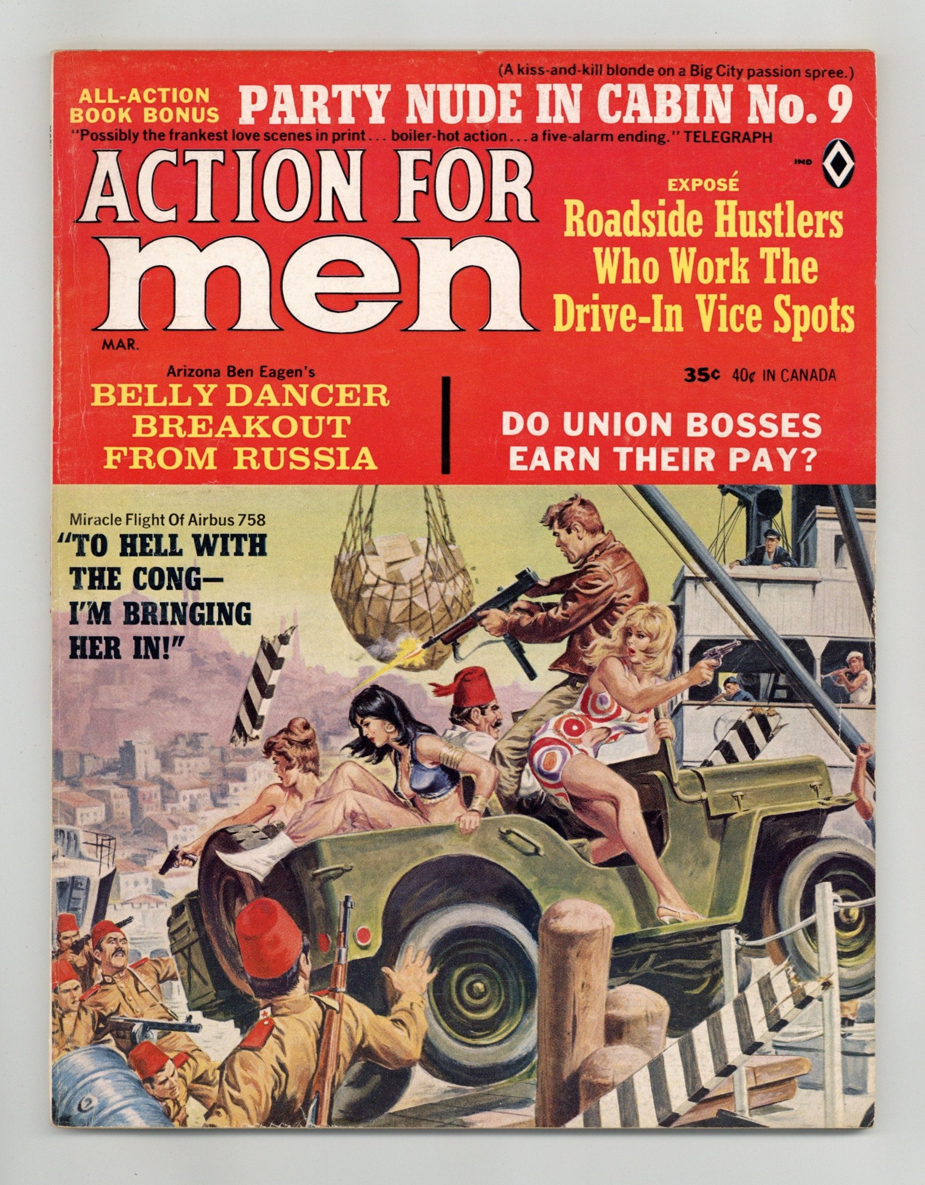 Tags: Diamond GroupPublished Mar 1968 by Vista Publications.$23.00Volume 12, Issue 2 - March, 1968. Men's adventure stories with some model photo galleries and usually contains a true story bonus. Cover by Earl Norem. Stories are "Party Nude in Cabin No. 9" (W) Lionel White (A) double page spread by Earl Norem, "Belly Dancer Breakout From Russia" (W) John Godfrey (A) Gil Cohen, and "Love-in with a Mini-Skirt Nymph" (W) David Lloyd (A) double page spread by Al Rossi. 8 1/2-in. x 11-in., 86 pages, B&W - Mature Readers. Cover price $0.35.