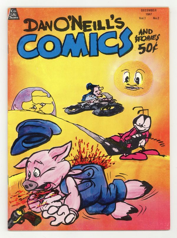 Published 1971 by Comics and Comix Co..$14.50Volume 1, Issue 2 "December, 1947" Story, Art and Cover by Dan O'Neill. Dan O'Neill's scathing satire of political and religious themes using parodied versions of Disney characters and his most famous creations Hugh and Fred earned the ire and outrage of the public and editors alike with his syndicated news paper strip "Odd Bodkins", and eventually led to the loss of his syndication, and job! See what happens when he really lets loose in "Dan O'Neill's Comics"! 7-in. x 10-in., B&W. NOTE: Dates on the cover are used to aid in a parody manner. These issues were published in 1971. Cover price $0.50.