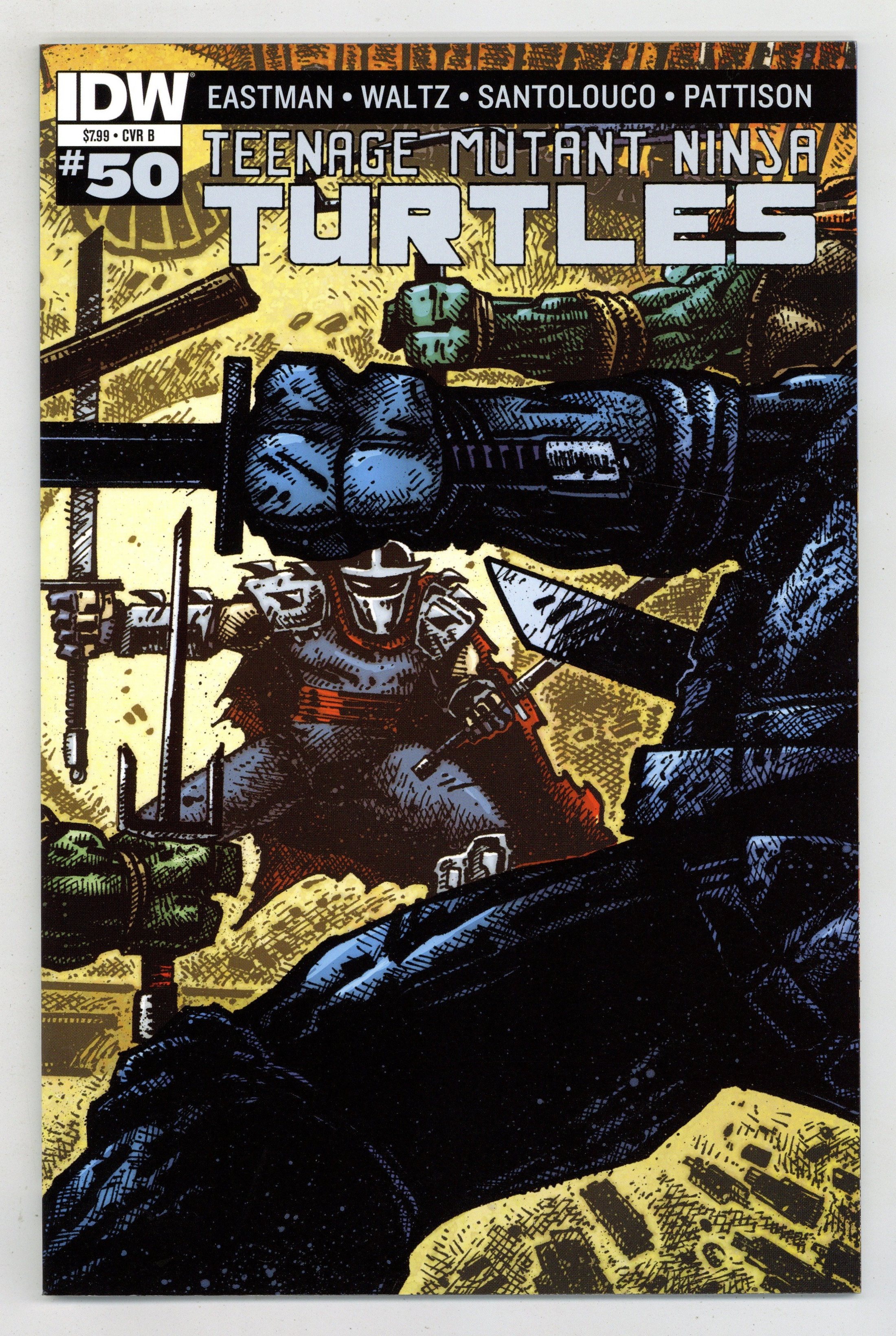 Published Sep 2015 by IDW Publishing.$22.00Written by Tom Waltz and Kevin Eastman. Art by Mateus Santolouco. Cover by Kevin Eastman. The epic conclusion to over four-years worth of storylines! The Turtles stand against Shredder for one final battle that will determine the fate of NYC, and the world, for years to come! 48 pages, full color. Cover price $7.99.