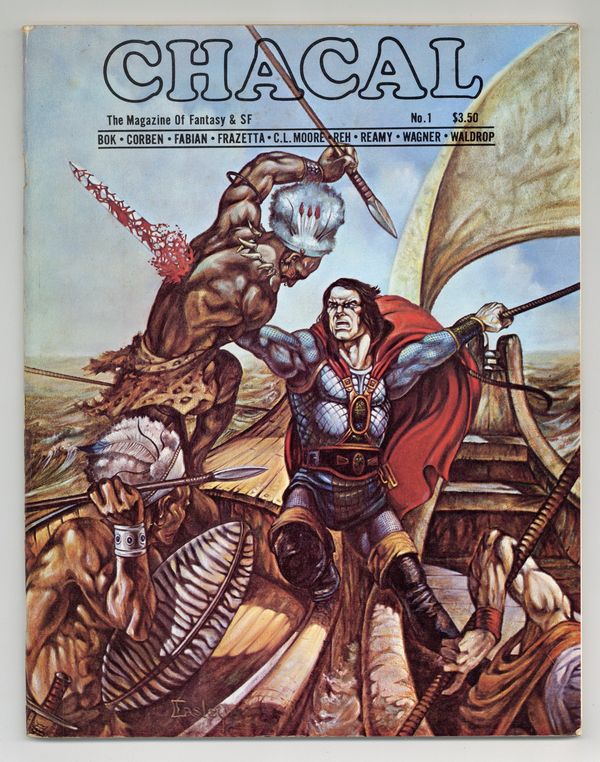 Subtitled "The Magazine of Fantasy & SF," Chacal features some of the biggest names in the industry. Issue #1 includes: Road of Azreal by Robert E. Howard, Der Untergang Des Abenlandesmenschen by Howard Waldrop, Jeff Easley portfolio, C.L. Moore interview, Mistress of Windraven by Tom Reamy, Hannes Bok article, and Sing A Last Song Of Valdese by Karl Edward Wagner. Cover art by Jeff Easley. Back cover art by Richard Corben. 60 pgs. Cover price $3.50.