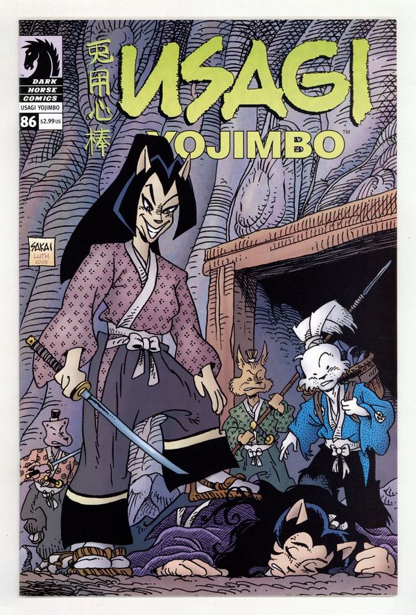 Published Aug 2005 by Dark Horse.$12.00Story and art by Stan Sakai. Usagi Yojimbo has been captured! The greedy Lord Sanada is operating an illegal gold mine in the Geishu province and has put Usagi and Tomoe Ame to work as his slaves. Sanada has been killing those who would get in the way, and his deadliest enforcer-- Noriko "the blood princess"--is none other than Tomoe's own cousin! In this issue, master storyteller Stan Sakai's fourth installment of the six-part "The Treasure of the Mother of Mountains," the cruel sociopath Noriko reveals a devastating secret to her enslaved cousin. Meanwhile, the young page Motokazu fears for Tomoe's safety and rides off without permission to help her ... and has an unexpected adventure of his own! 32 pages, B&W. Cover price $2.99.