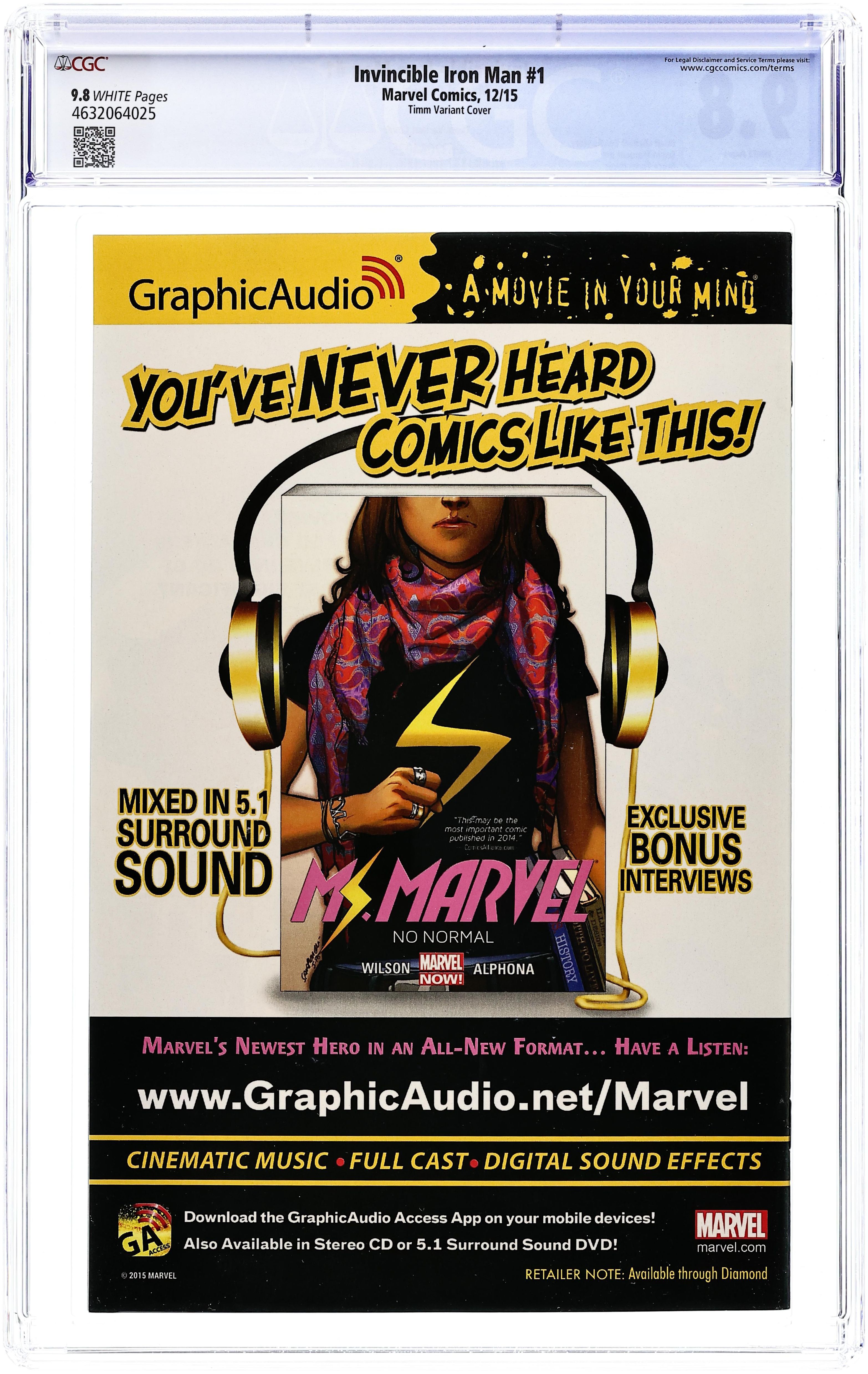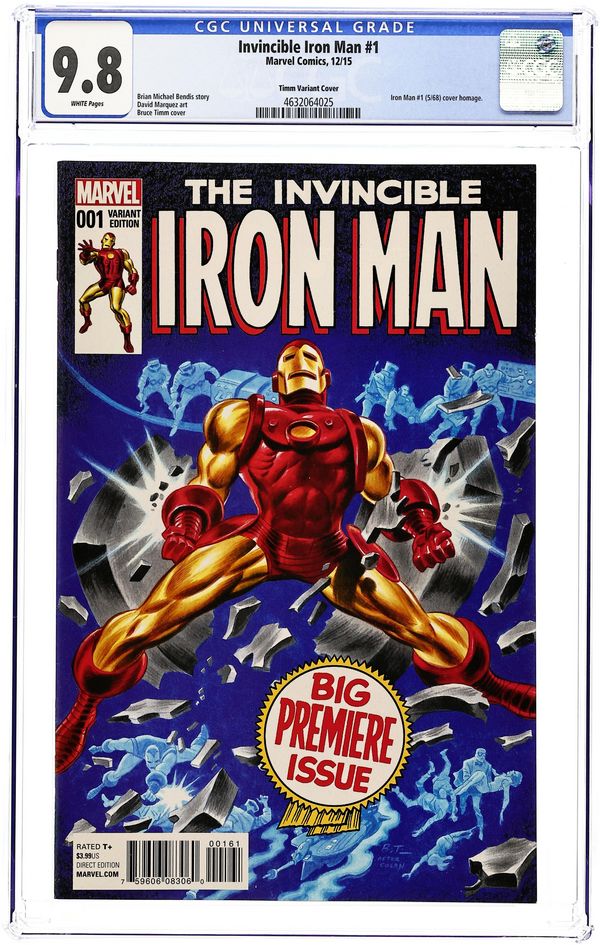Limited 1 for 25 Retailer Incentive Variant Cover. Written by Brian Michael Bendis. Art by David Marquez. Cover by Bruce Timm. Exploding out of the pages of SECRET WARS, one of the most popular super heroes in the world gets a gigantic new series. From the creators that brought you ULTIMATE SPIDER-MAN comes new armor, new supporting cast, new villains and a new purpose that is going to tear itself across the entire Marvel Universe and beyond. with a shocker of a last page that will have everyone talking and the return of one of Tony's biggest nemeses, you will not want to miss this!! Also, who are Tony's biological parents? The quest begins here! 32 pages, full color. Rated T+ Cover price $3.99.
