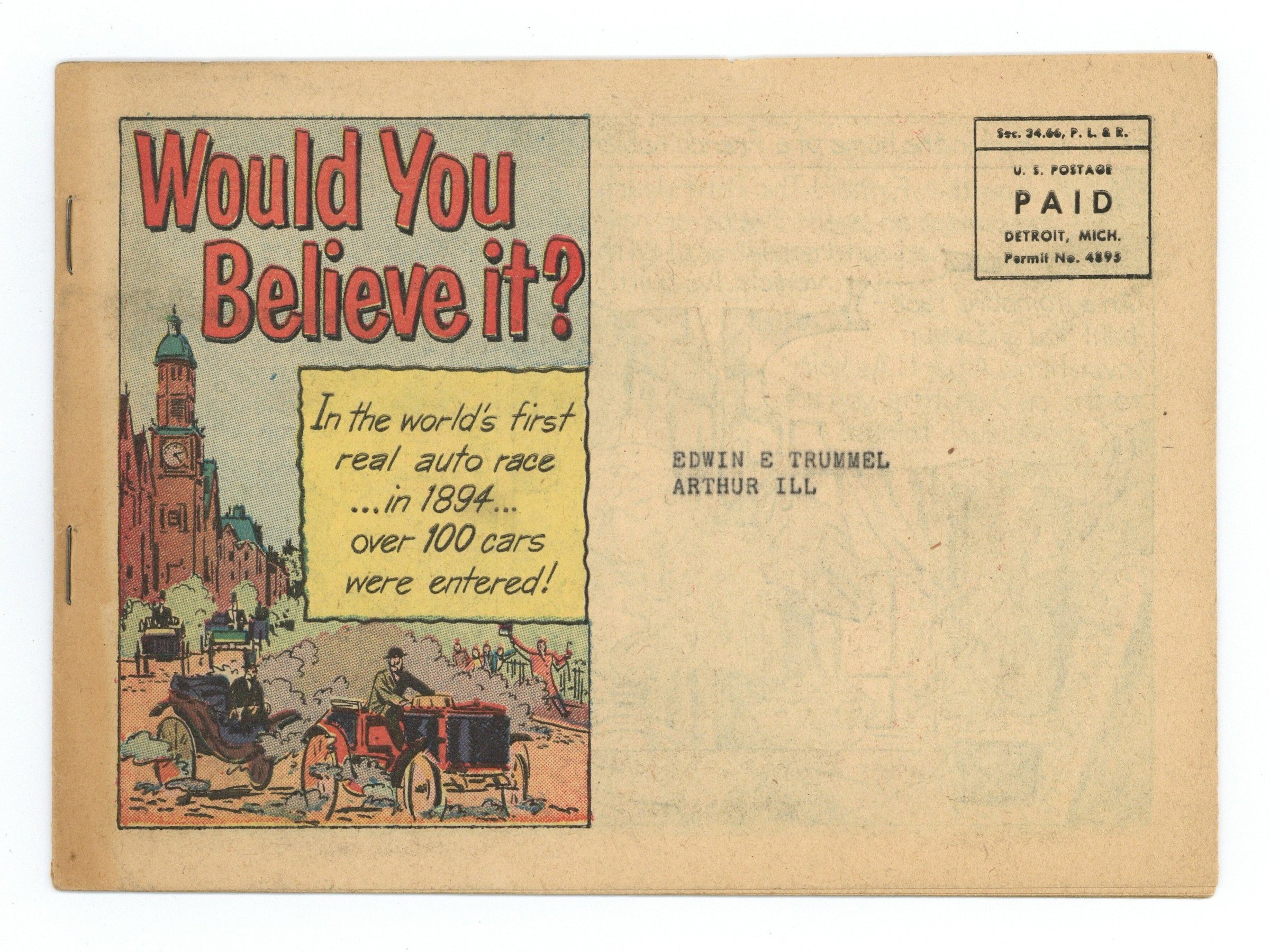 Would You Believe It? (1953) was a promotional comic book distributed by Dodge Motor Company. Would you believe, in the world's first auto race, in 1894, over 100 cars were entered. This booklet is filled with many other fun facts and trivia. 16 pages, full color, newsprint, 7-in. x 5-in.