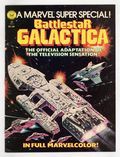 $21.00Painted cover by Bob Larkin. The official comic book adaptation of the original 1970s science fiction TV series, Battlestar Galactica, written by Roger McKenzie, with art by Ernie Colon; In a distant time and place, a terrible war was waged between man and machine...the humans lost; Now, guided by their last surviving warship - the mighty Battlestar Galactica - a handful of survivors travel through space in search of the lost home of their ancestors, a shining planet known through ancient records, a planet called Earth. Includes an interview with special effects artist John Dykstra and much background information on the Battlestar Galactica universe. The story was reprinted in issues #1-3 of the Battlestar Galactica comic. 50 pgs. Full-color. This printing is magazine-sized and has the yellow Spider-Man Marvel logo in the corner. Cover price $1.50. Cover price $1.50.