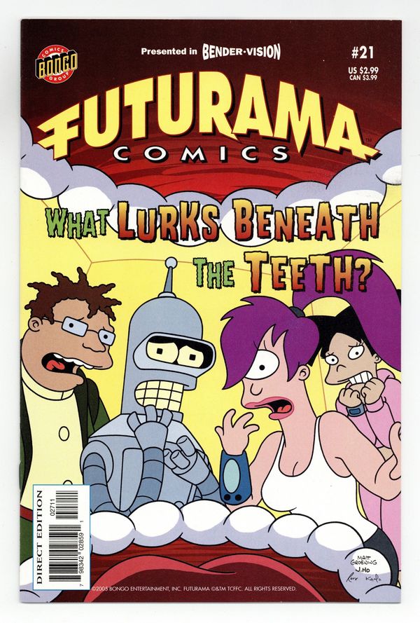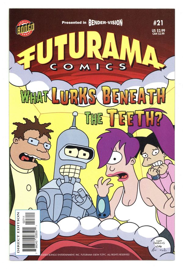 $19.50by Rogers and Delaney. Fry takes his first trip to the dentist in over one thousand years and discovers that his dental fillings are receiving a sub space from an unknown alien race. But their friendly entreaties for peace soon turn to a declaration of war after Fry begins grinding his teeth in his sleep. 32pgs, FCSRP: $2.99 Cover price $2.99.