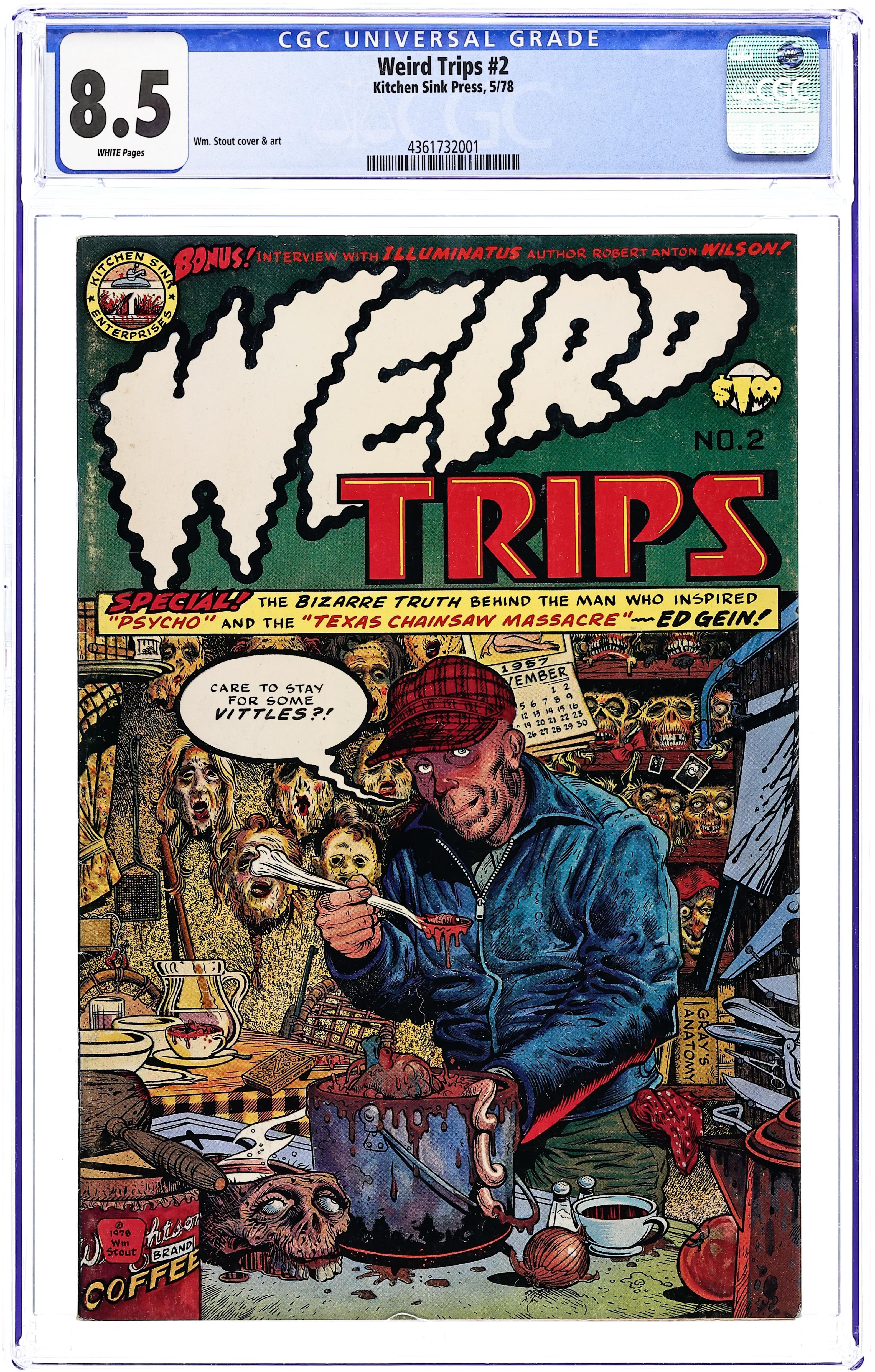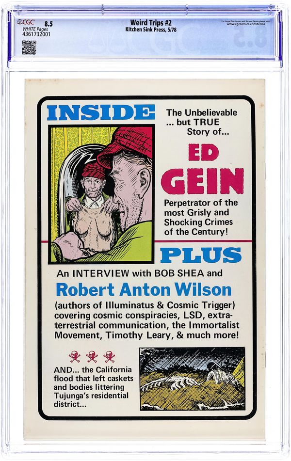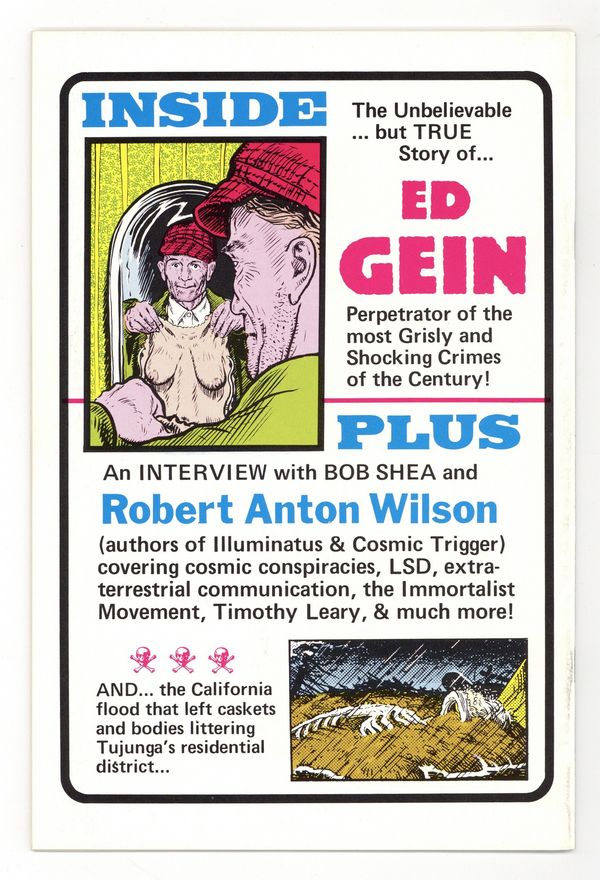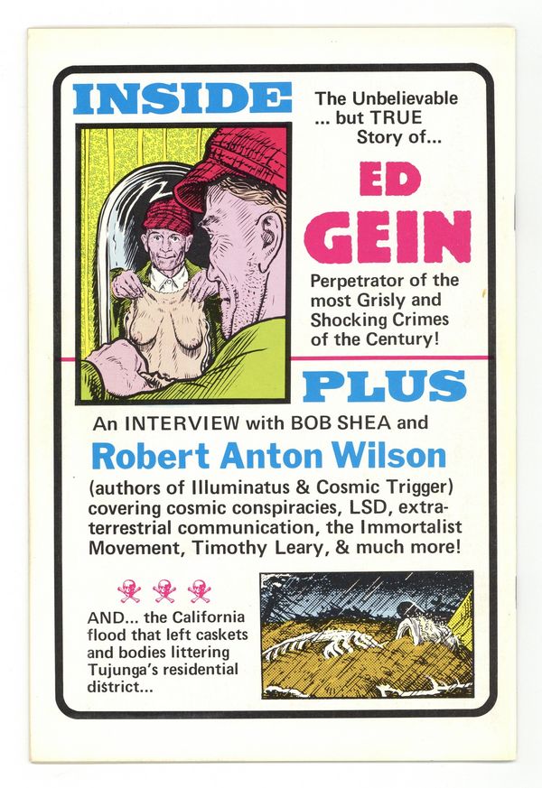 Adults only. Ed Gein cover by Bil Stout. Content: Interview w/ Bob Shea & Robert Anton Wilson; "The Wonderful World of Animals", by Joel Beck; "Thirty Escape in Boothill Breakout", by Greg Dempsey; "Ed Gein and the Lefy Hand of God", by David Schreiner. Cover price $1.00.