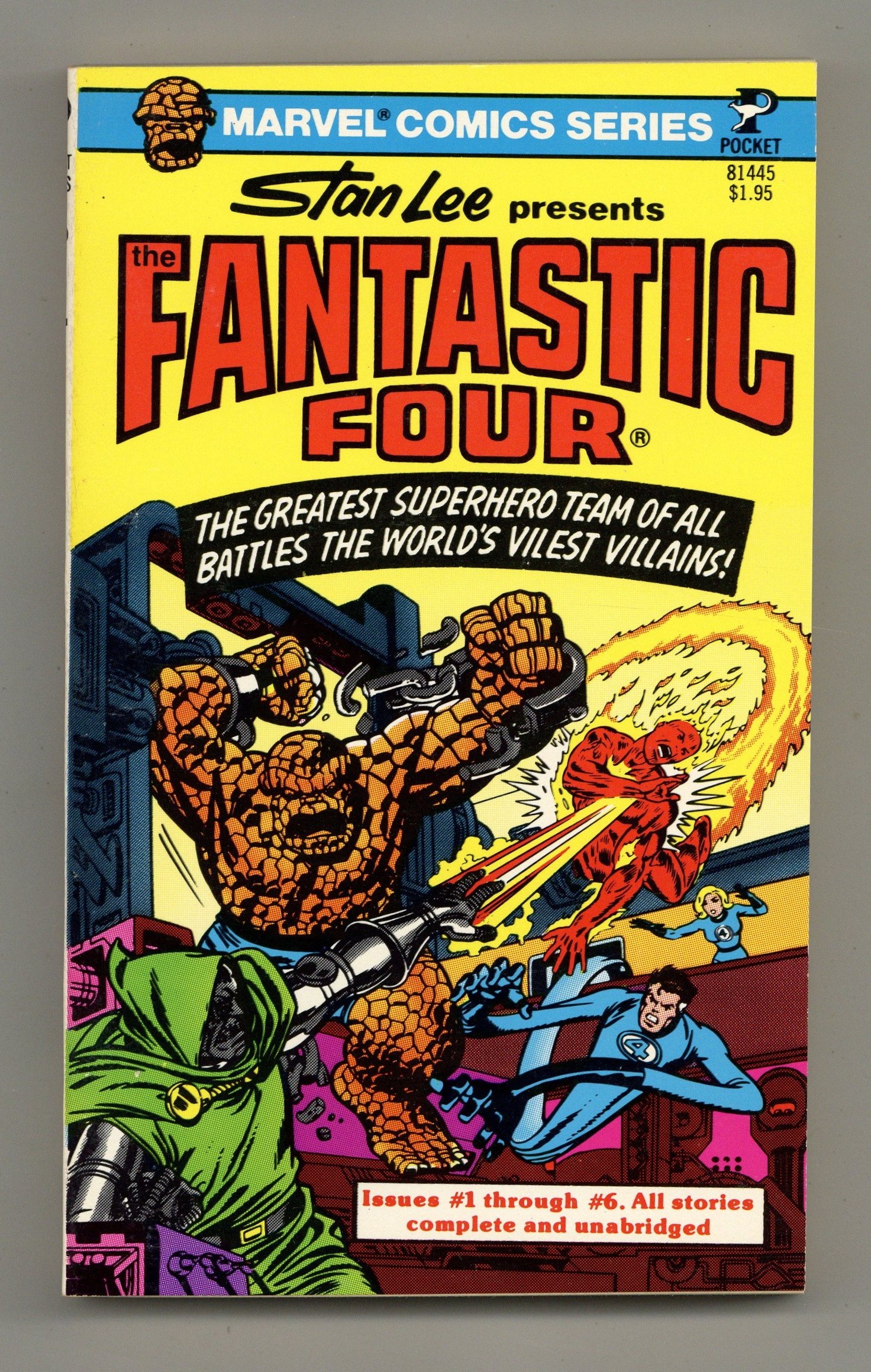 Published Nov 1977 by Pocket Books.$9.801st printing. Collects Fantastic Four (1961-1996 1st Series) #1-6. Written by Stan Lee. Art by Jack Kirby. The greatest superhero family battles the world's vilest villains. Mr. Fantastic, the Human Torch, Invisible Woman, and the Thing must face the menace of the Mole Man, the alien Skrulls, the Savage Sub-Mariner, and the diabolical Dr. Doom. Softcover, 4-in. x 7-in., 160 pages, full color. Cover price $1.95.