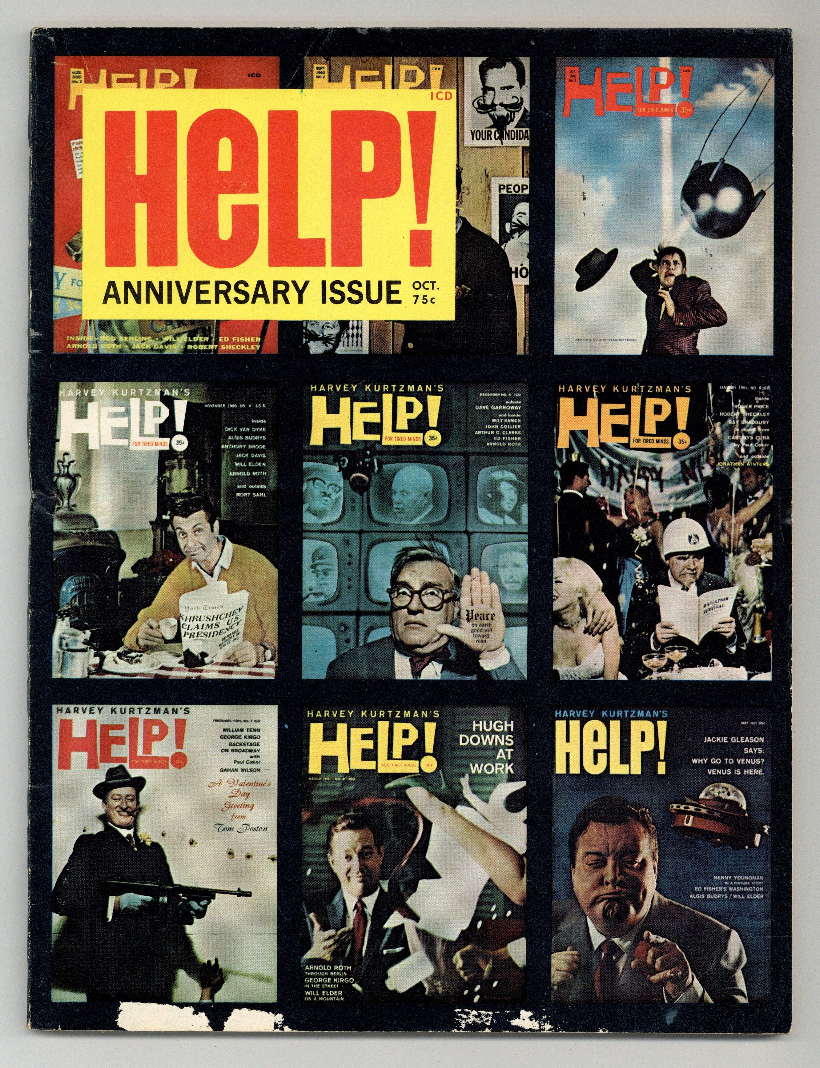 Harvey Kurtzmans legendary follow-up to the original MAD launched the careers of many future stars of comics, comedy and publishing, including associate editor Terry Gilliam. This all-fumetti issue reprints photo-comics from past issues of Help, featuring Tom Poston, Sylvia Miles, sci-fi author Algis Budrys, Paul Glaser, artist Russ Heath, Henny Youngman, Henry Jaglom, and Orson Bean. Sometimes listed as Vol. 2, #9. 96 pages. Cover price $0.75. Cover price $0.75.