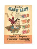 Published 1961 by Joe Lowe Co..$23.00Popsicle Gift List (1961) Featuring Popsicle Pete was a promotional booklet published by the Joe Lowe Corp. This Popsicle Pete booklet was distributed as an advertising giveaway premium at grocery stores. Featuring Bob Hope, it provides color illustrations of prizes that could be obtained by redeeming coupons from Popsicles, Fudgsicles, Creamsicles and Dreamsicles. Includes baseball gloves, baseballs, footballs, small cap guns, cameras, a pocket knife and other gifts. 12 pages, full color, newsprint, 5-in. x 7-in.