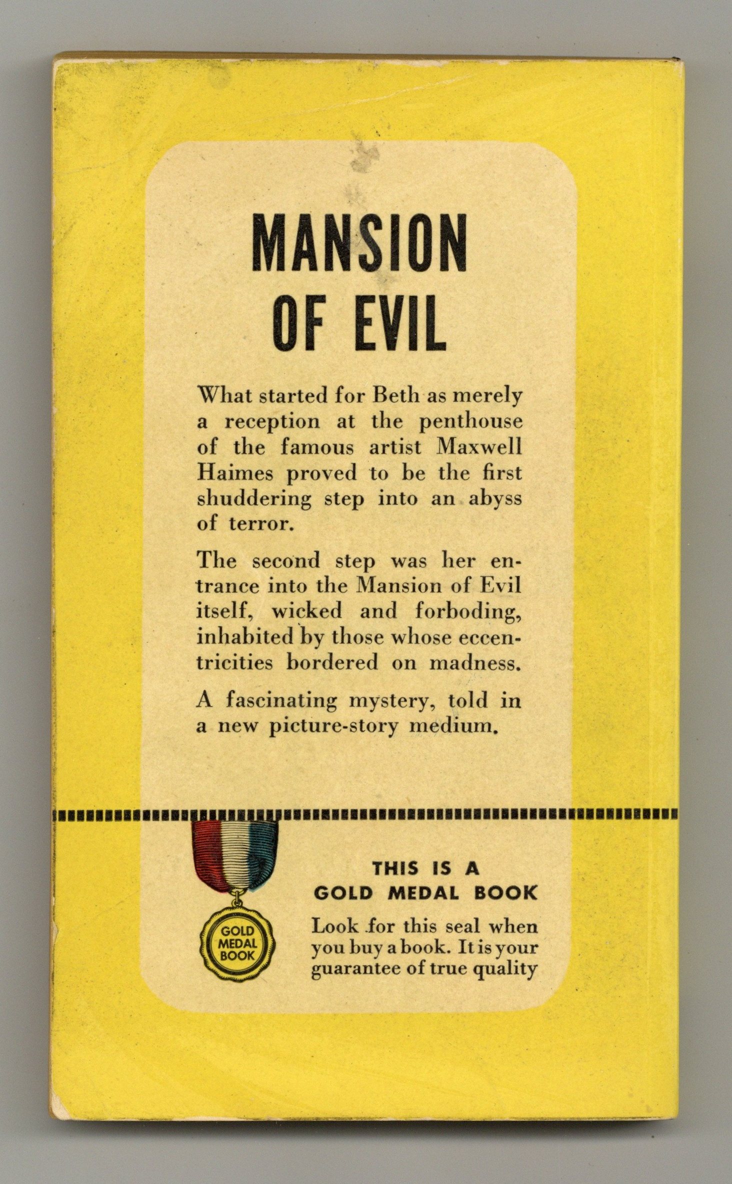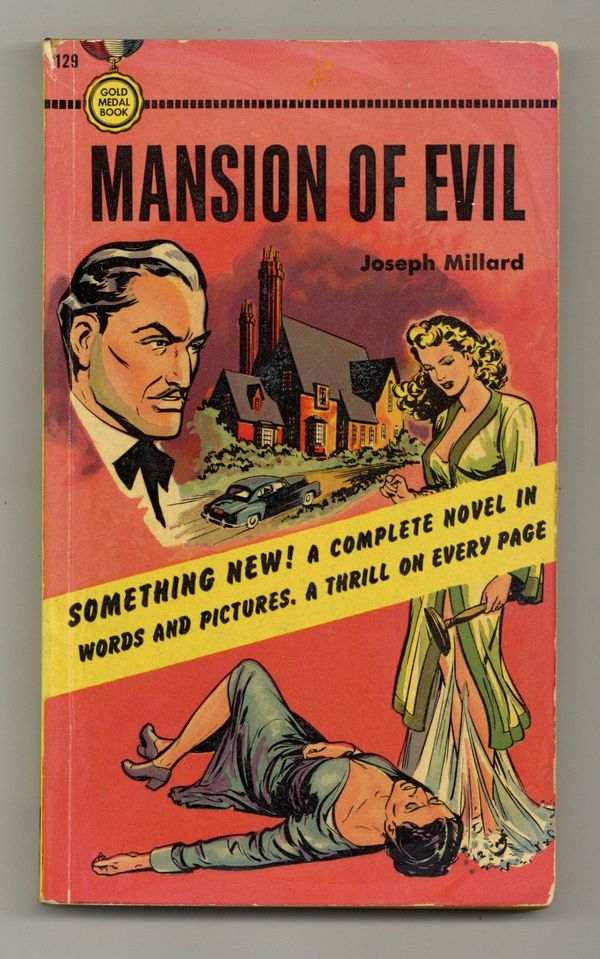 $500.00Mansion of Evil (#129, 1950) by Joseph Millard, is a macabre tale of murder and mystery presented in full-length comic graphic novel format. Published by Gold Medal Books as a paperback, rather than as a traditional comic book. The story features a leading man who closely resembles the gothic-horror film legend Vincent Price. 212 pages, full color, square bound softcover.