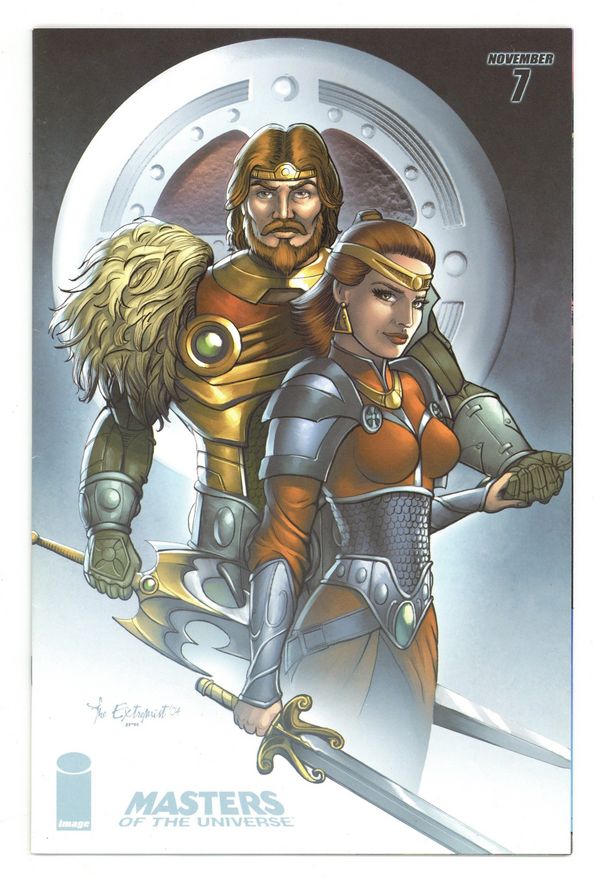 He-Man.org Variant cover by Eamon O'Donoghue and Jeremy Roberts. Written by VAL STAPLES. Art and cover by LEANNE SHAW. FC 32 pgs. CONCEPT: In a realm where sorcery meets science, The Masters of the Universe set forth to protect all of Eternia from the evil onslaught of Skeketor and his evil forces. It's an epic tale of good versus evil, where there is new danger and suspense at every turn. The story we all loved from the 80's is reborn and relaunched for a new era. THIS ISSUE: Stratos, member of the Avionian High Council, played an active roll in the events that have shaped his kingdom over the past few decades, resulting in a shaky peace with the Adreenids. But in this reflection on his past, Stratos remembers a time when the war to secure the Egg of Avion plagued the land. Cover price $2.95.