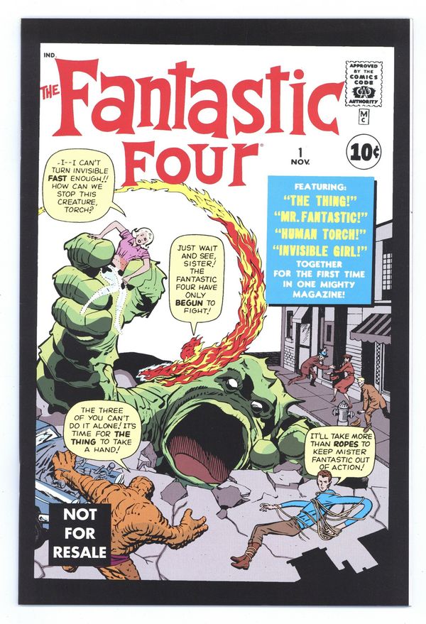 Same as original cover except Nor For Resale at bottom, left. Black border around cover. Reprint edition that originally came packaged with 1st Appearance Thing from Marvel Legends series 11 (Legendary Riders Series). Reprints the first appearance of Mr. Fantastic, the Thing, the Human Torch (Johnny Storm), and the Invisible Girl as they battle the Mole Man in "The Fantastic Four!" Script by Stan Lee, pencils by Jack Kirby, inks by Art Simek. Kirby/Dick Ayers cover.