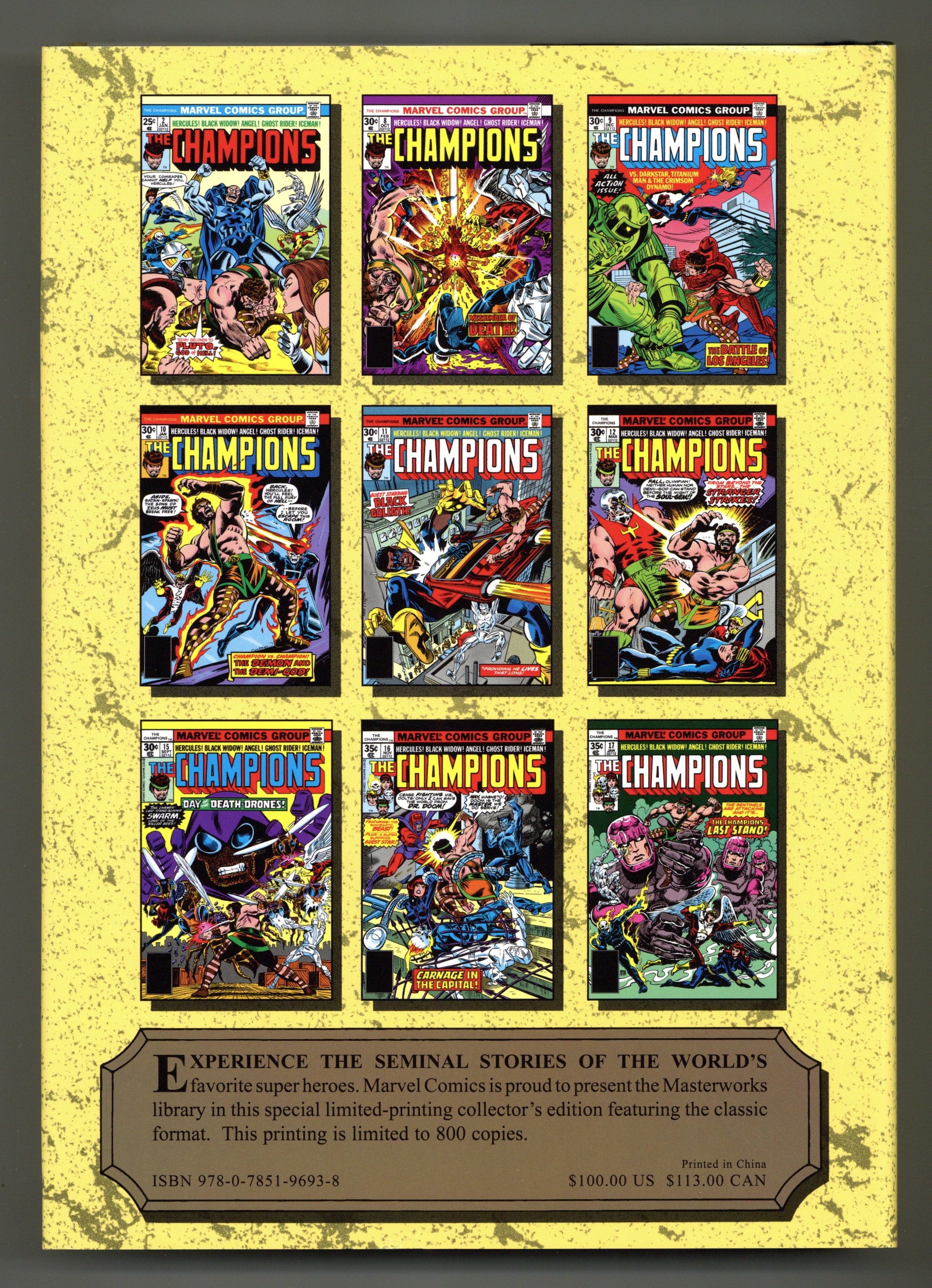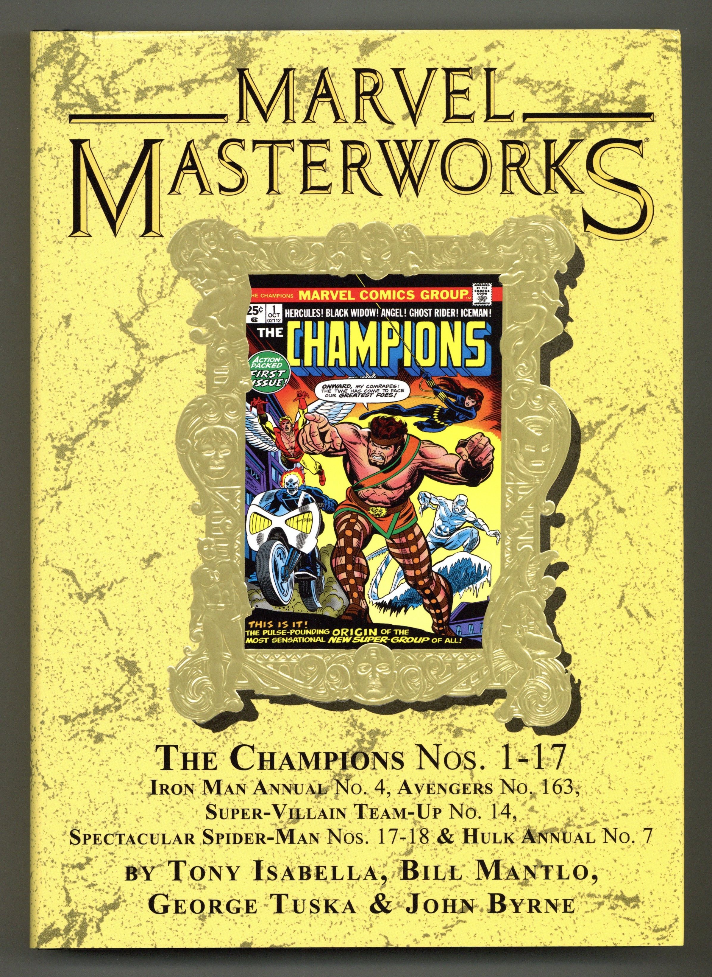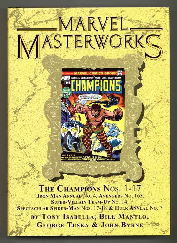 Volume 229 - 1st printing. "The Champions!" Collects Champions (1975-1978 Marvel) #1-17, Iron Man (1968-1996 1st Series) Annual 4, Avengers (1963-1996 1st Series) #163, Super-Villain Team-Up (1975-1980) #14 and Spectacular Spider-Man (1976-1998 1st Series)#17-18. Cover by Gil Kane. Join the Black Widow, Hercules, Ghost Rider, Iceman and Angel as they form an all-new super-team: the Champions! This massive Masterworks collects the Champions' complete adventures in a single volume! Every issue, every highlight, every page as the lives of these Marvel icons play out together. Their struggles will reveal the origin of the man who created the Black Widow, pit them against the combined might of Magneto and Doctor Doom; unleash the Crimson Dynamo and Titanium Man on Los Angeles; team them with the Stranger in the fight for an Infinity Gem; and bring fan-favorite artist John Byrne aboard for some of his greatest early work, including stories featuring the Sentinels and Brotherhood of Evil Mutants! Hardcover, 432 pages, full color. NOTE: Limited to 800 copies. Cover price $100.00.