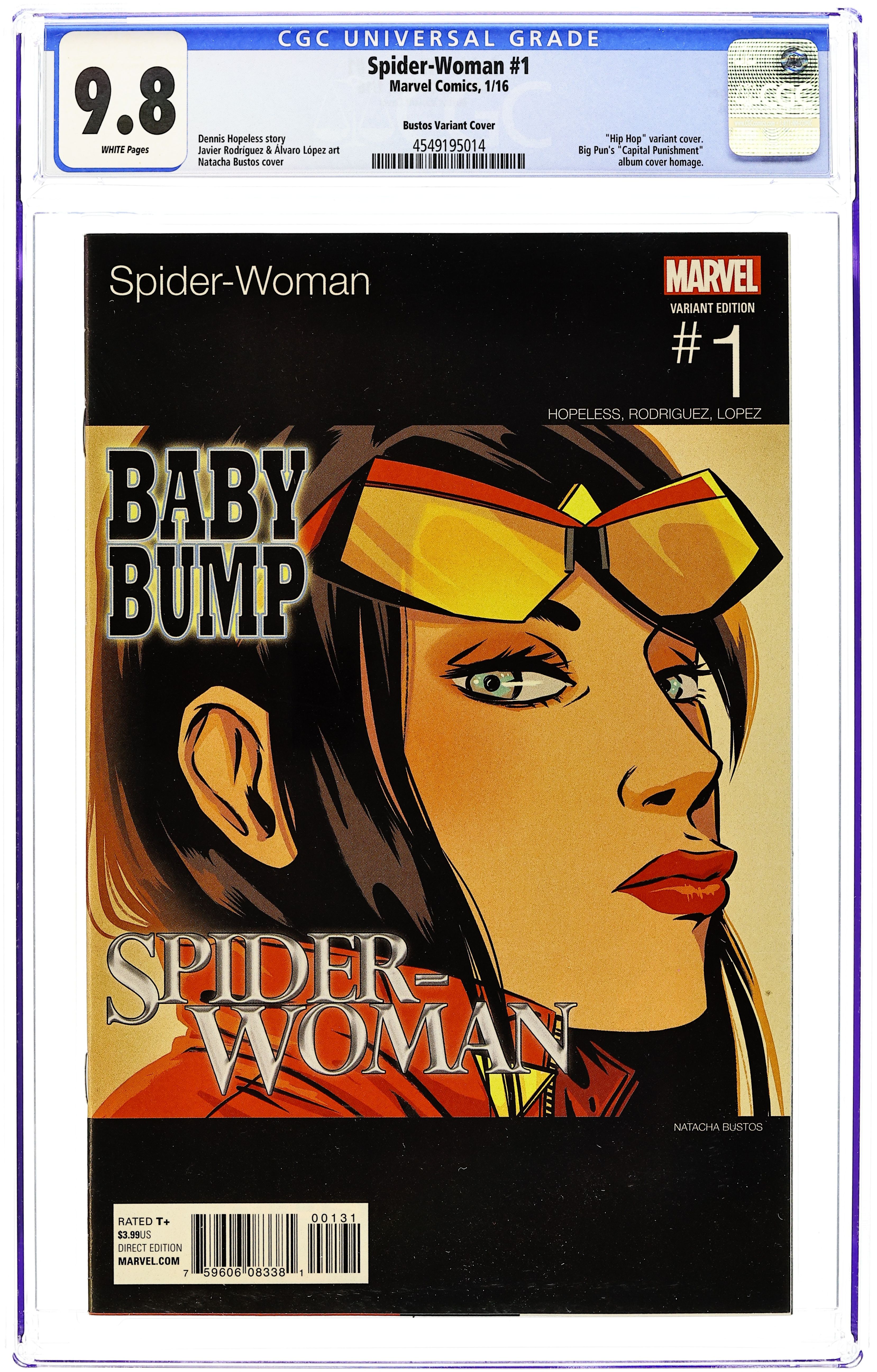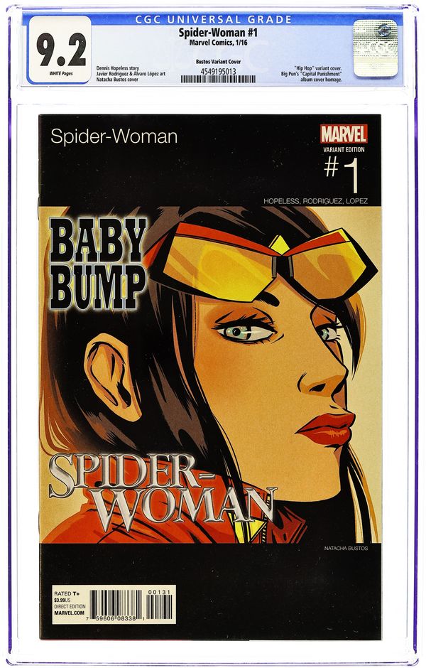 Hip Hop Variant Cover by Natacha Bustos. Written by Dennis Hopeless. Art by Javier Rodriguez. Jessica Drew is a private investigator, a super hero and… a mom to be? Since we last saw her, Spider-Woman's got a whole NEW responsibility -- she's super heroing for two now, after all! Ben Urich and Porcupine are still along for the adventure, too, and aren't making Jess' life any easier - half the time they won't even let her leave the car! How's a gal supposed to save innocent people and keep herself out of harm's way? See how in the mother of all Spider-Stories! 32 pages, full color, Rated T+ Cover price $3.99.