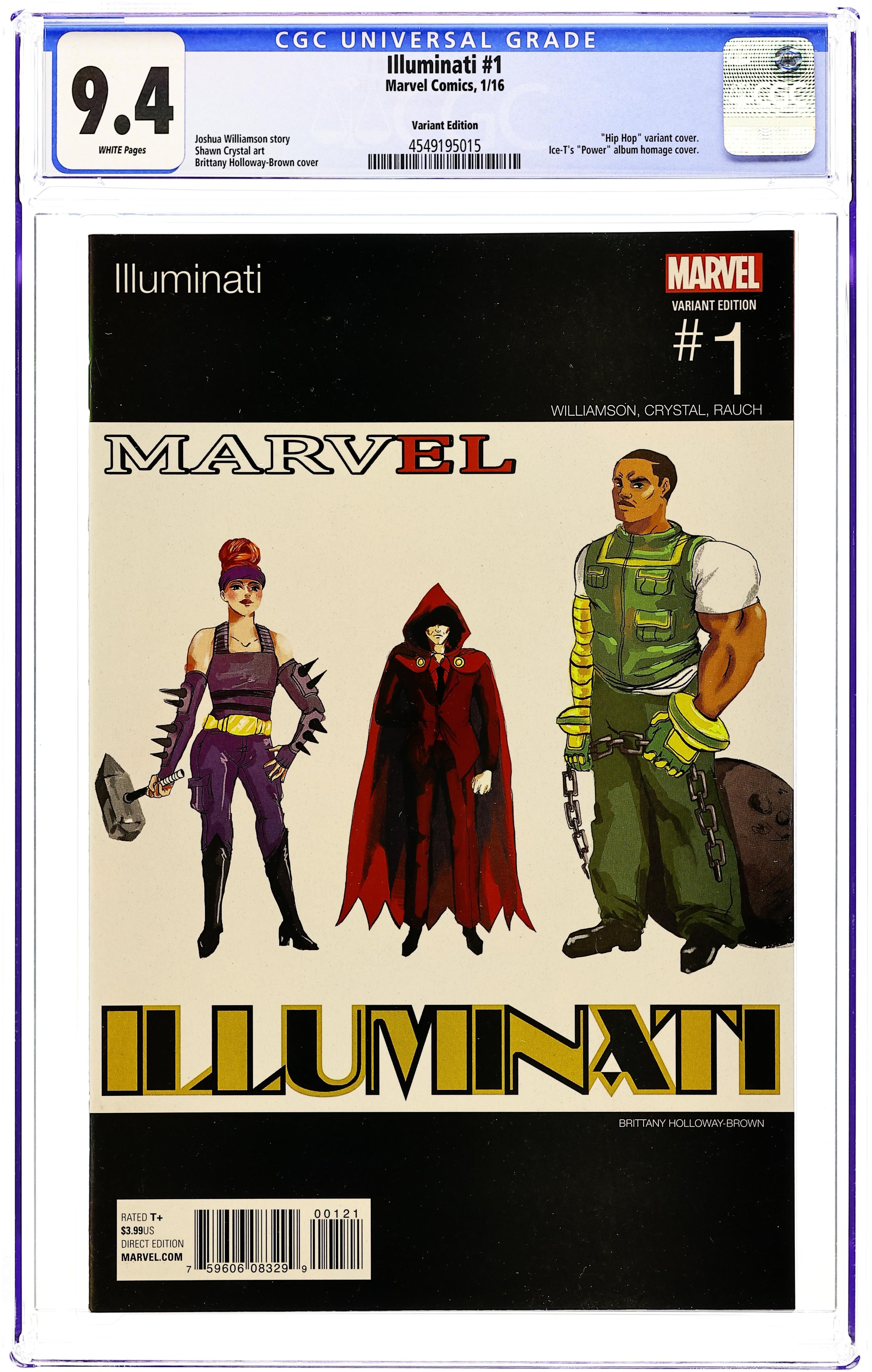 Hip Hop Variant Cover by Brittany Holloway-Brown. Written by Joshua Williamson. Art by Shawn Crystal. 'Bad guys win every day… why not us?' How do the villains of the Marvel Universe live in a world where the sky is constantly filled with heroes? What do they do when they want out of that life? There is no escape. No future. Who saves the villains? The Hood believes he might be that savior. He wants everyone to have a place at the table. Now all he needs to do is build his army… Featuring Titania, Mad Thinker, Thunderball, Black Ant and Enchantress, Illuminati is a tale of villains just trying to survive in the All-New All-Different Marvel Universe. 28 pages, full color. Rated T+ Cover price $3.99.