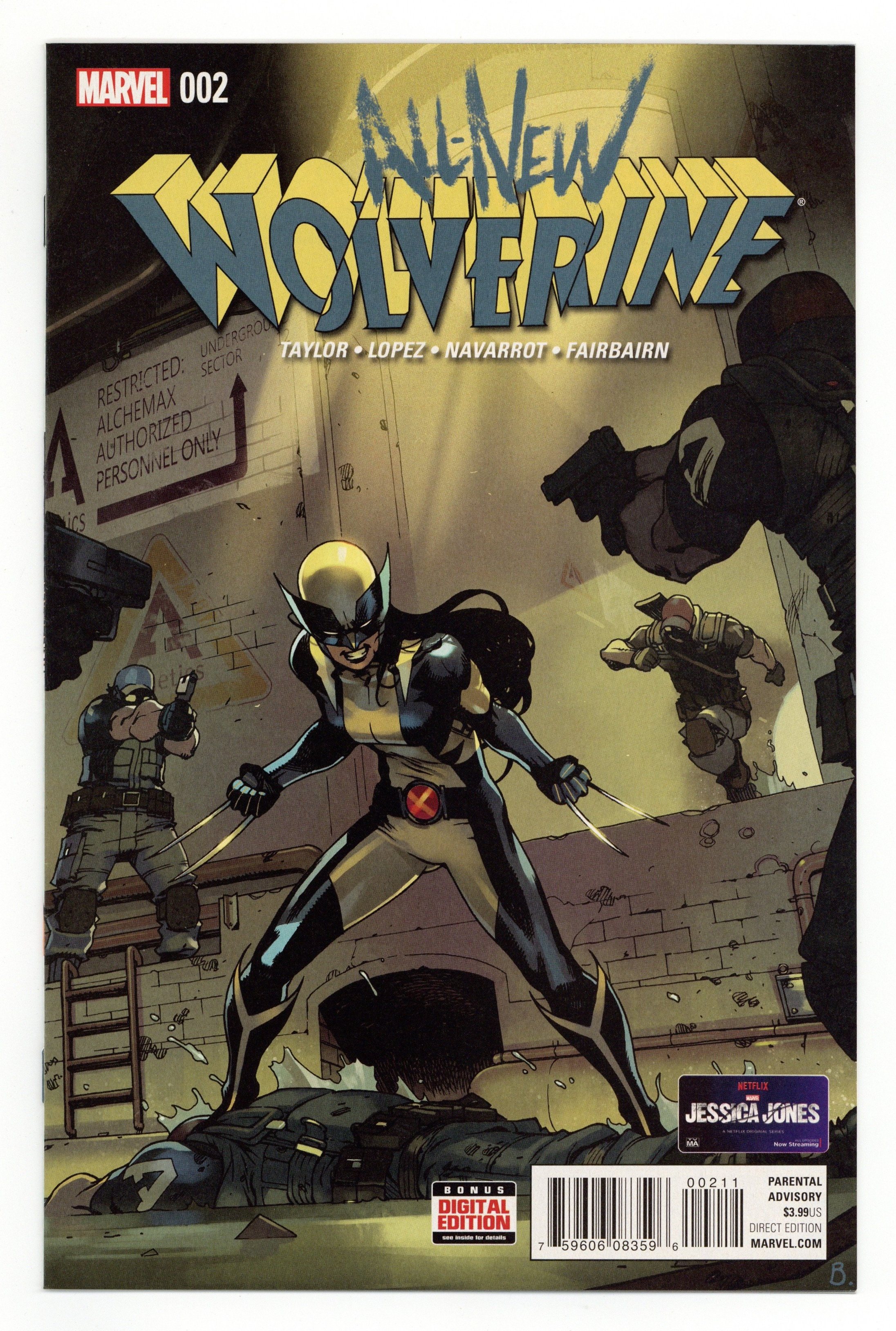 Written by Tom Taylor. Art by David Lopez and David Navarrot. Cover by Bengal. LAURA KINNEY EMBRACES HER DESTINY. HERE! COMES! WOLVERINE! X-23 was created to be a weapon and for a time, that's all she was. But with the help of her mentor, LOGAN-the original WOLVERINE-she escaped that dark past. Tragically, Logan has fallen, but Laura will continue in his footsteps as a hero. Recent events have her doing everything in her power to keep those around her alive, as violent forces are hell-bent on mutual destruction. If anyone can stop them, it's Laura. She is the best there is at what she does. She is THE ALL-NEW WOLVERINE. 28 pages, full color. Parental Advisory Cover price $3.99.